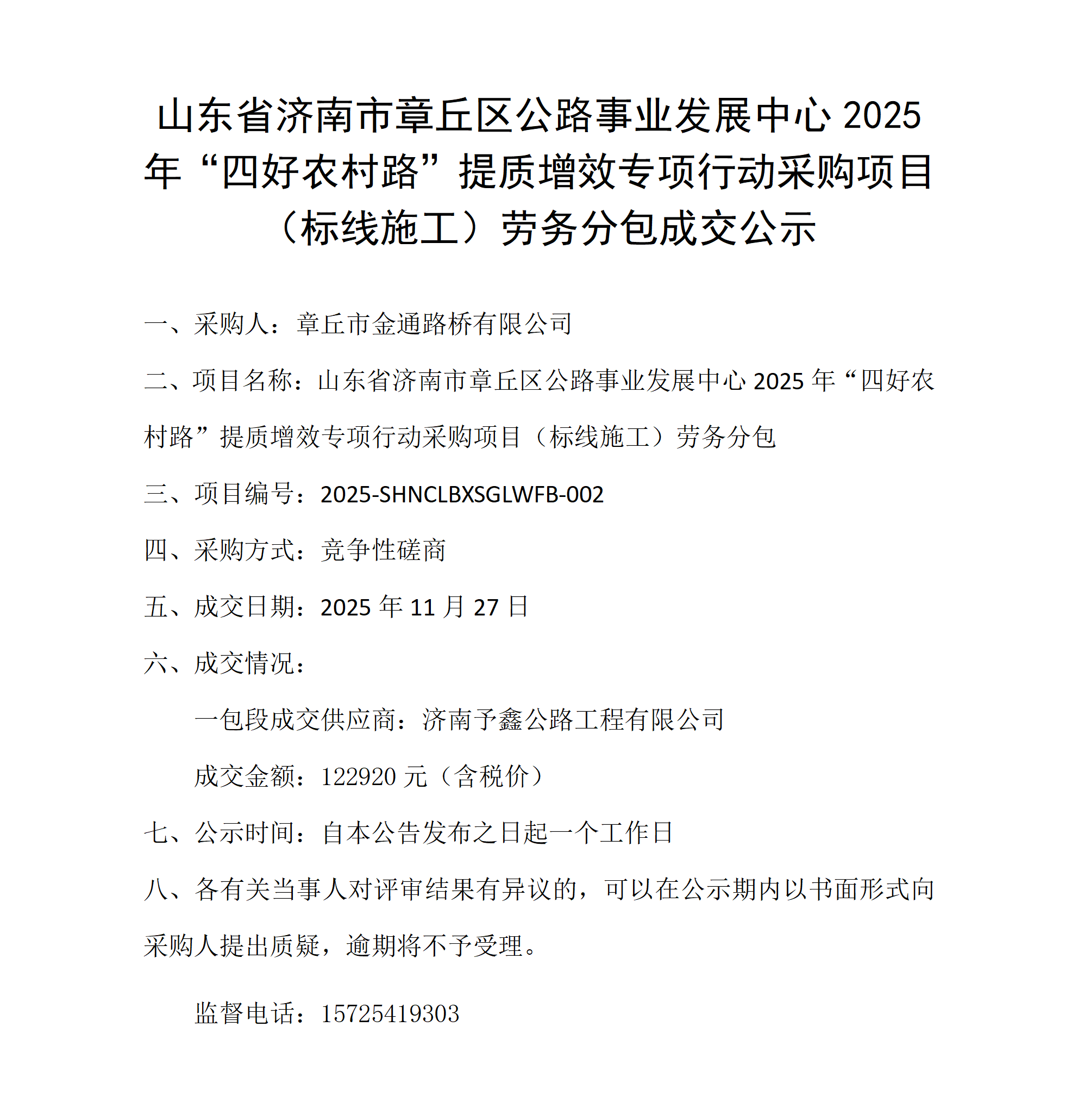 山东省济南市章丘区公路事业发展中心2025年“四好农村路”提质增效专项行动采购项目(标线施工)劳务分包成交公示