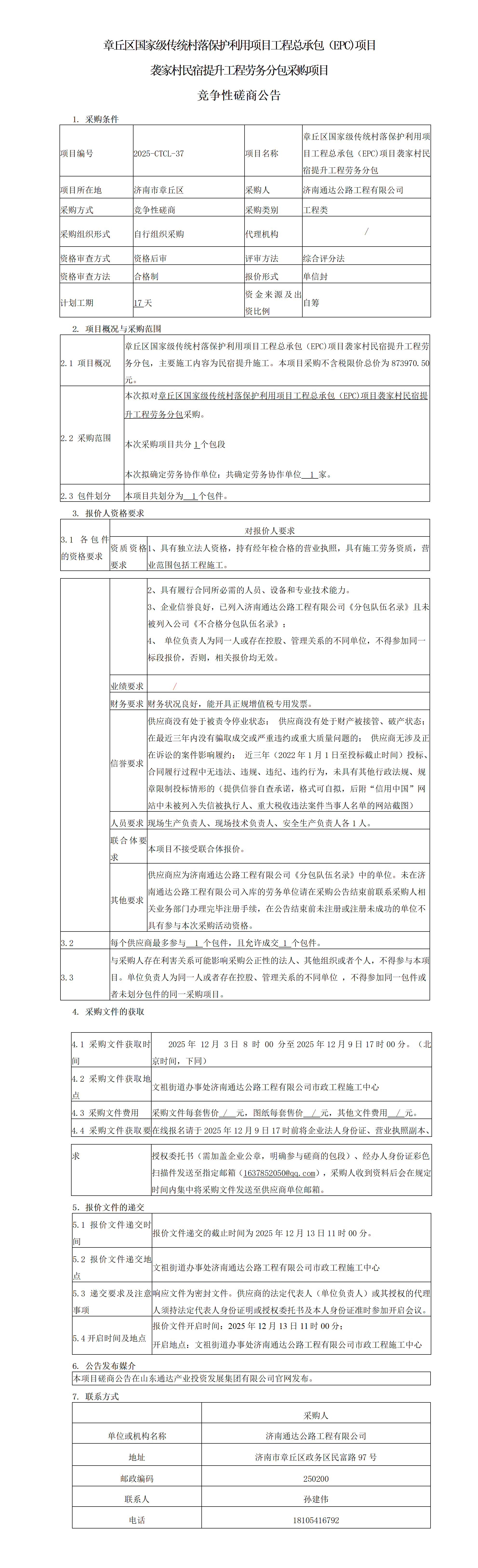 章丘区国家级传统村落保护利用项目工程总承包(EPC)项目石匣村民宿提升工程劳务分包采购项目竞争性磋商公告