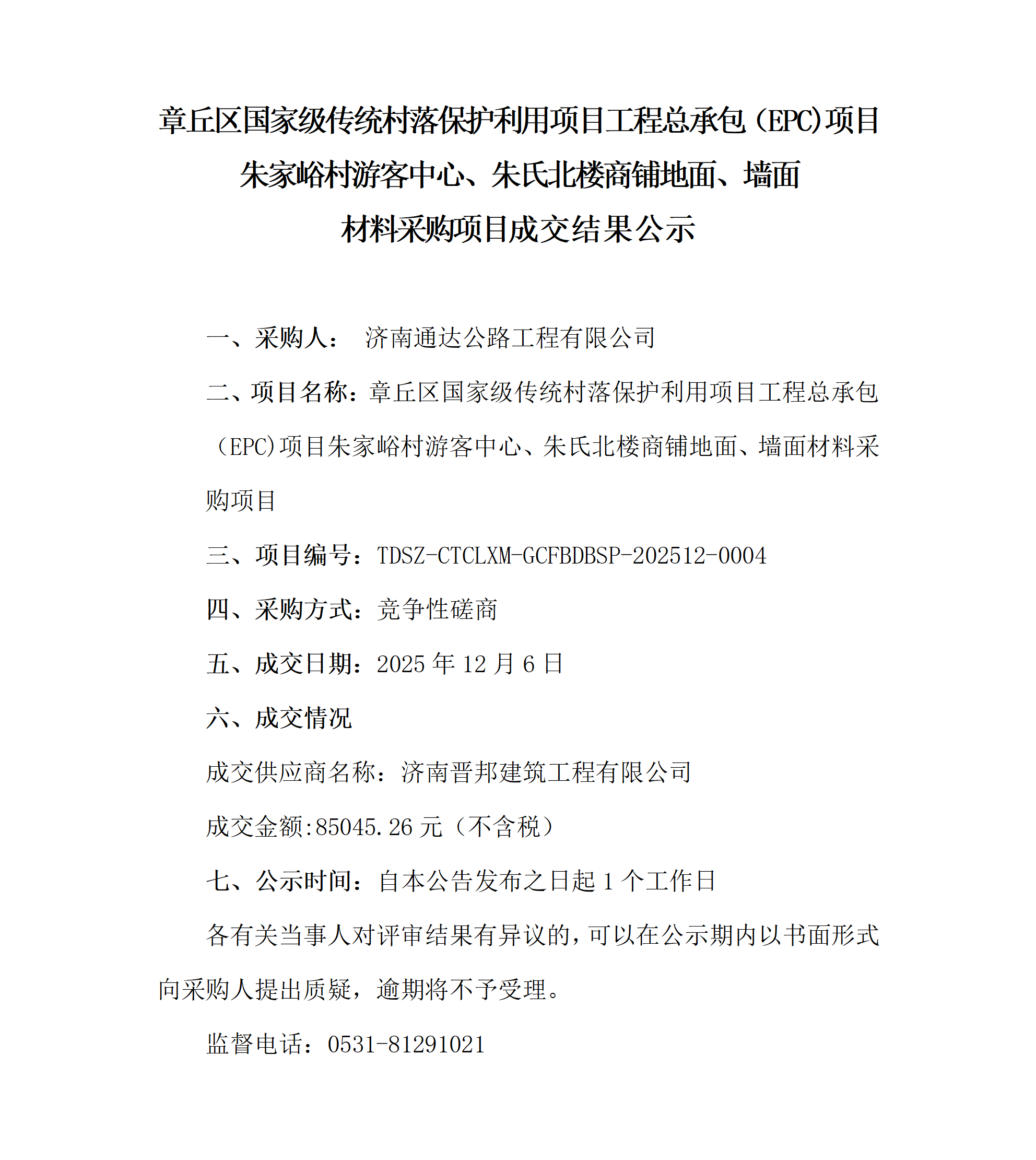 章丘区国家级传统村落保护利用项目工程总承包(EPC) 项目朱家峪村游客中心、朱氏北楼商铺地面、墙面材料采购项目成交结果公示