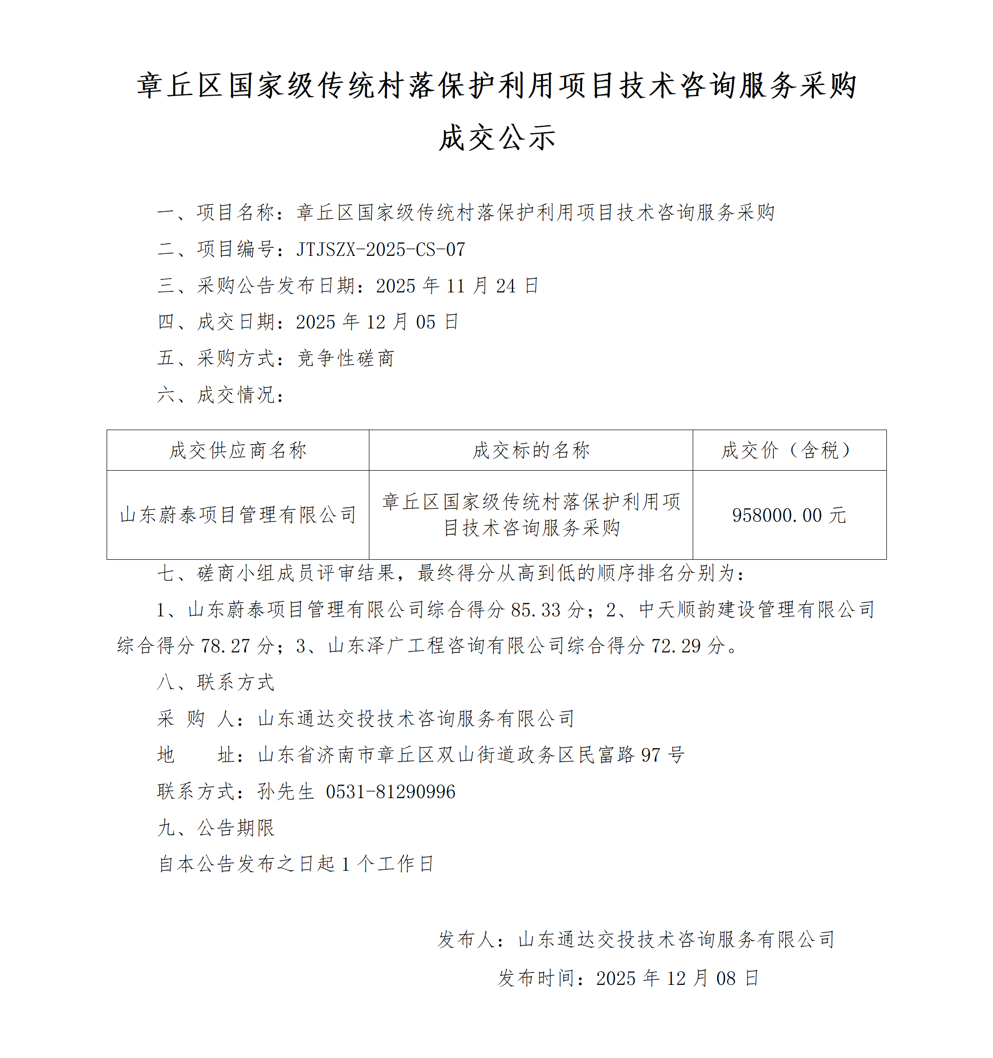 章丘区国家级传统村落保护利用项目技术咨询服务采购成交公示