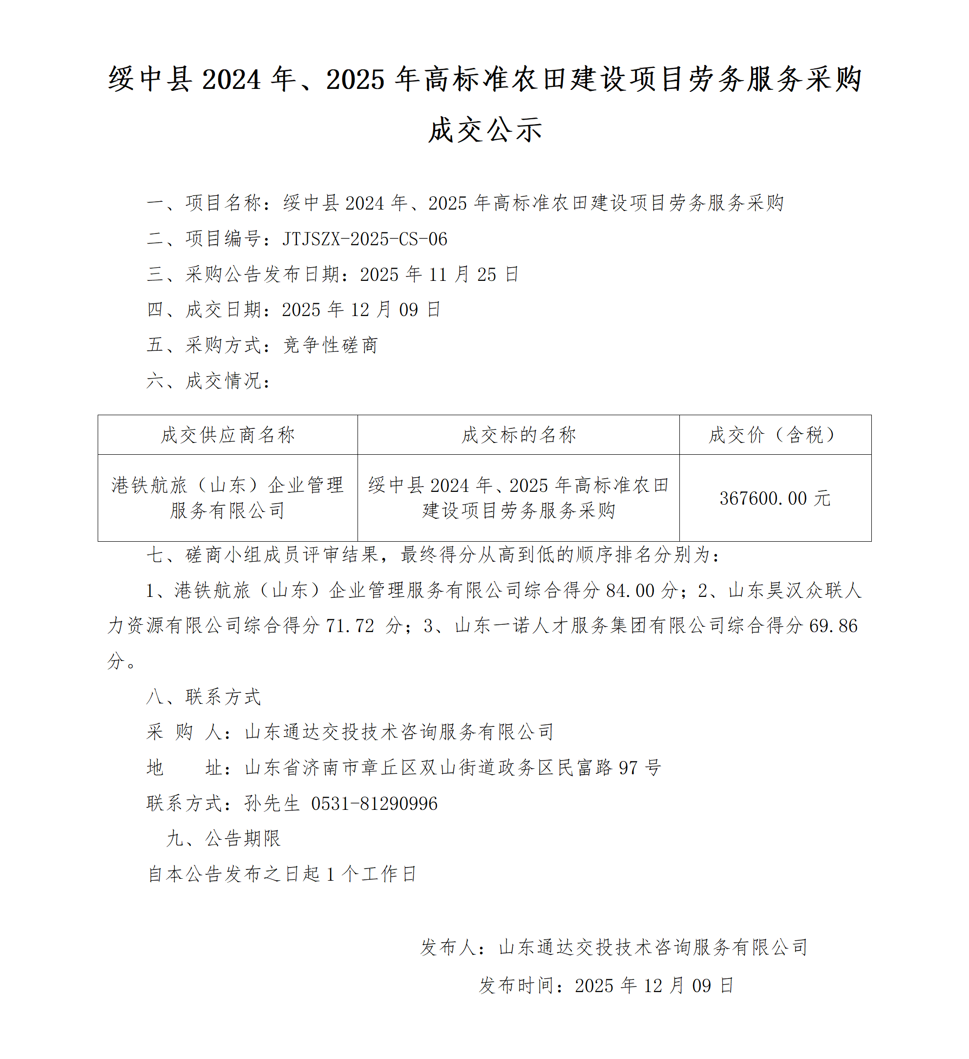 绥中县2024年、2025年高标准农田建设项目劳务服务采购成交公示