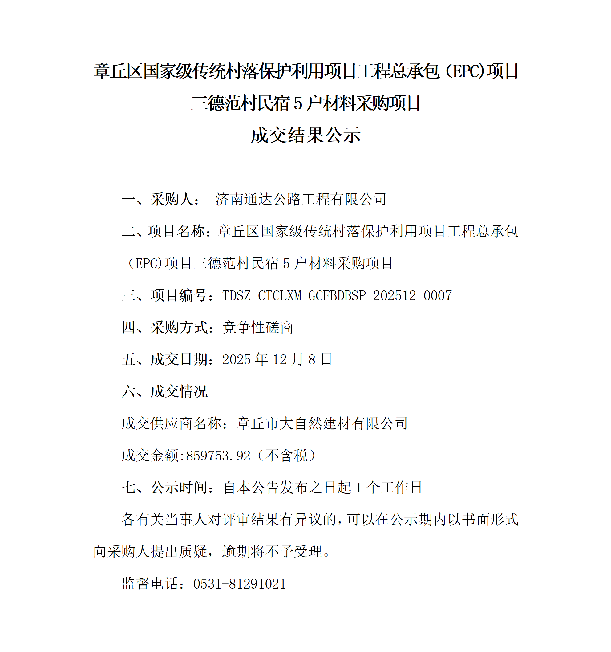 章丘区国家级传统村落保护利用项目工程总承包(EPC)项目三德范村民宿5户材料采购项目成交结果公示