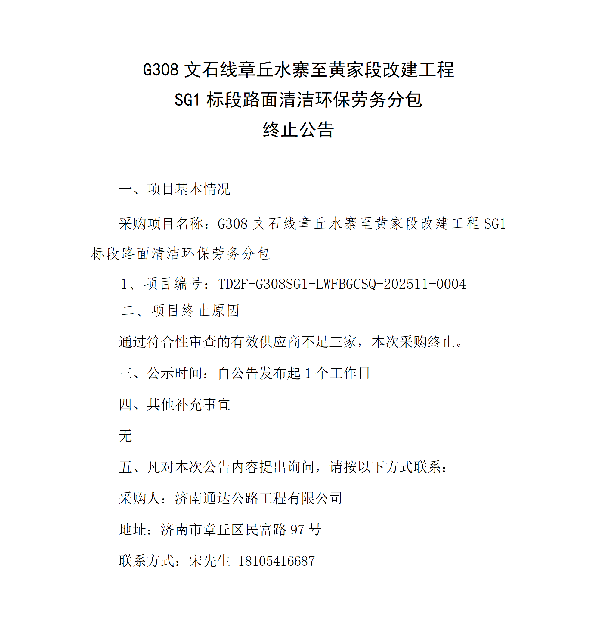 G308文石线章丘水寨至黄家段改建工程SG1标段路面清洁环保劳务分包终止公告