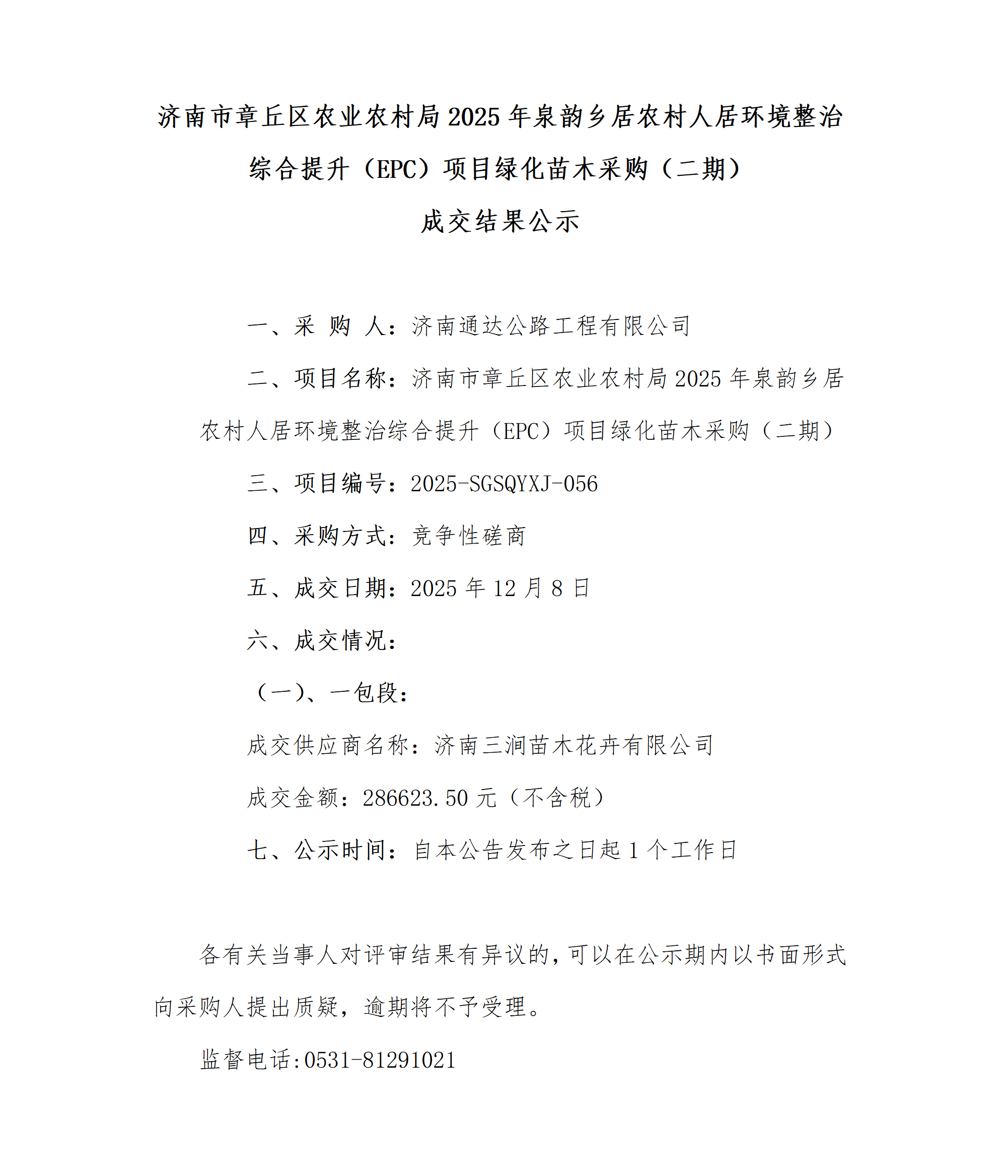 济南市章丘区农业农村局2025年泉韵乡居农村人居环境整治综合提升(EPC)项目绿化苗木采购(二期)成交结果公示