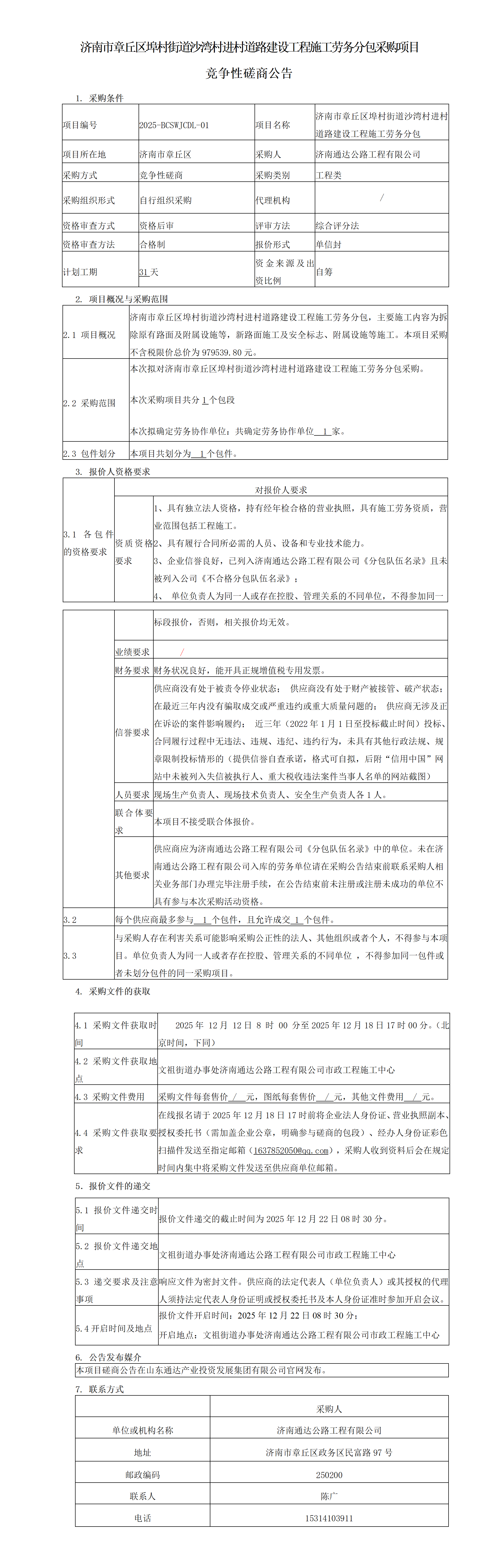 济南市章丘区埠村街道沙湾村进村道路建设工程施工劳务分包采购项目竞争性磋商公告