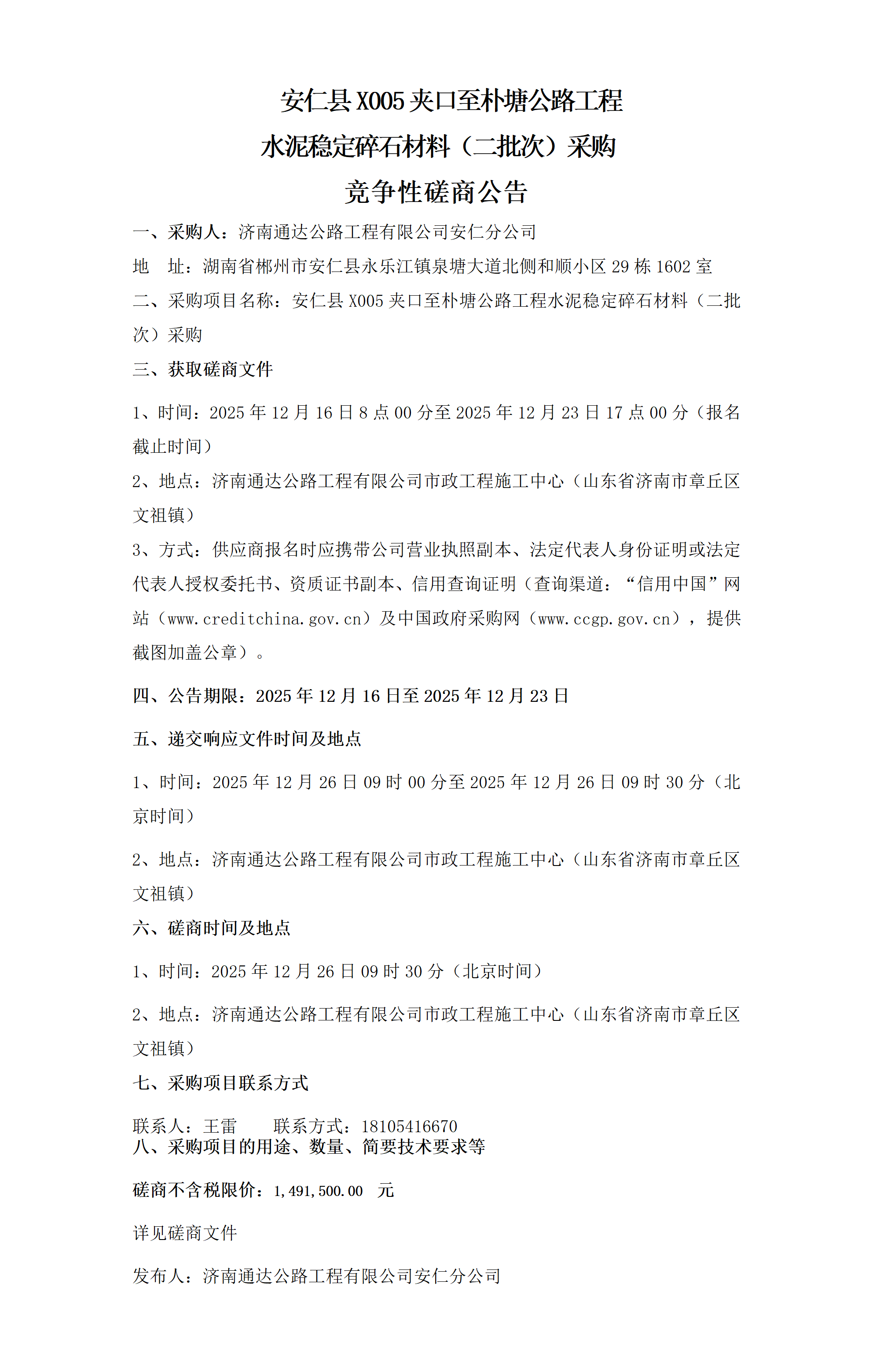 安仁县X005夹口至朴塘公路工程水泥稳定碎石材料(二批次)采购竞争性磋商公告