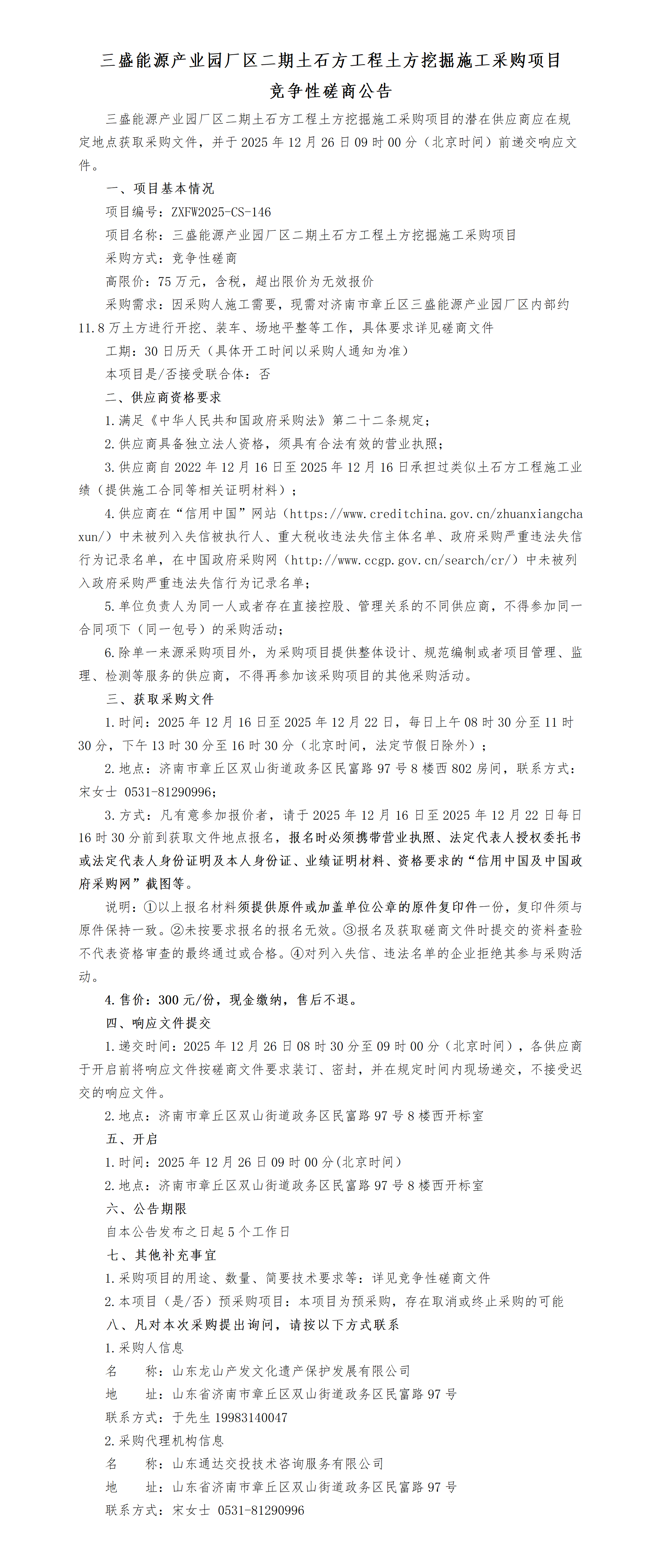 三盛能源产业园厂区二期土石方工程土方挖掘施工采购项目竞争性磋商公告