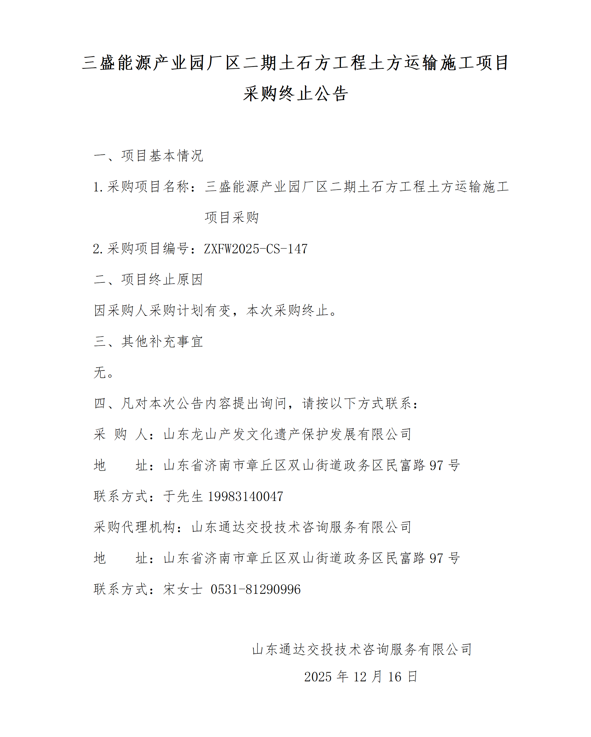 三盛能源产业园厂区二期土石方工程土方运输施工项目采购终止公告
