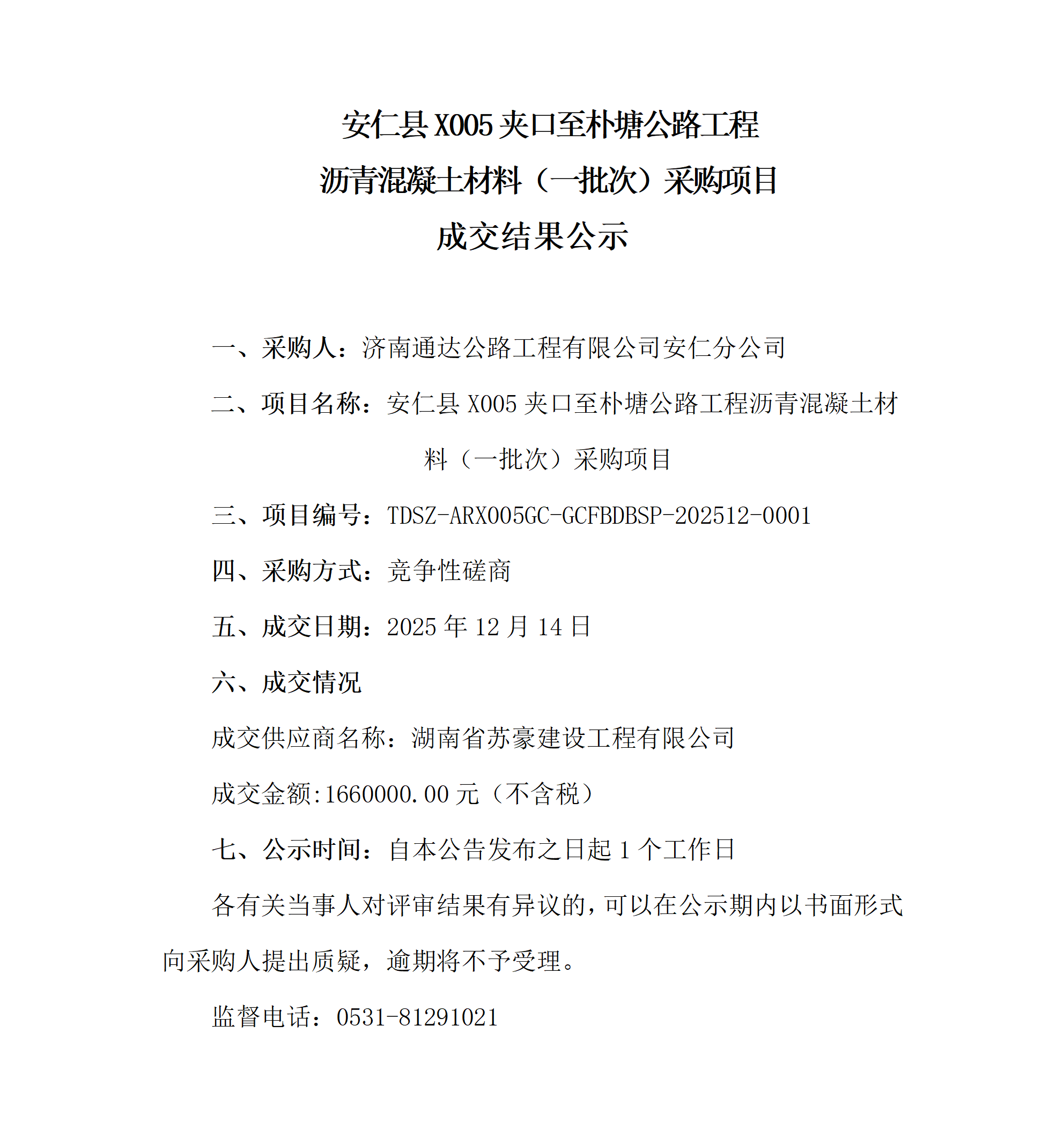 安仁县X005夹口至朴塘公路工程沥青混凝土材料(一批次)采购项目成交结果公示
