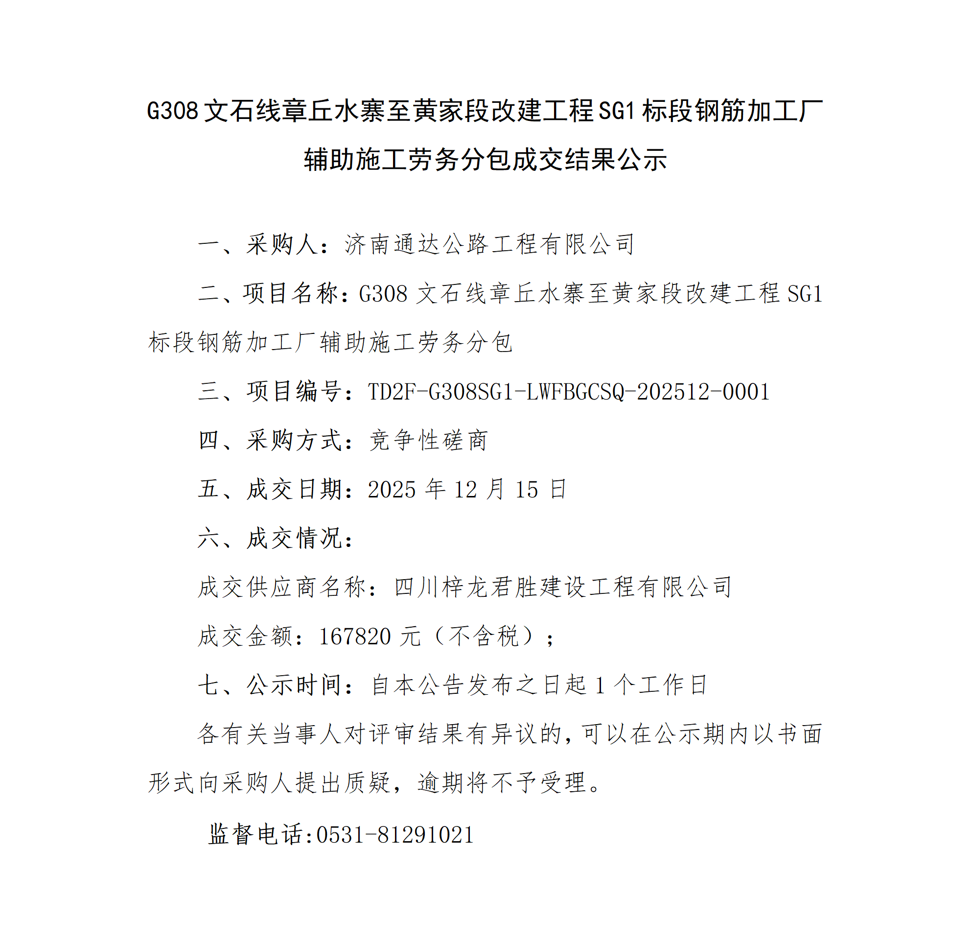 G308文石线章丘水寨至黄家段改建工程SG1标段钢筋加工厂辅助施工劳务分包成交结果公示