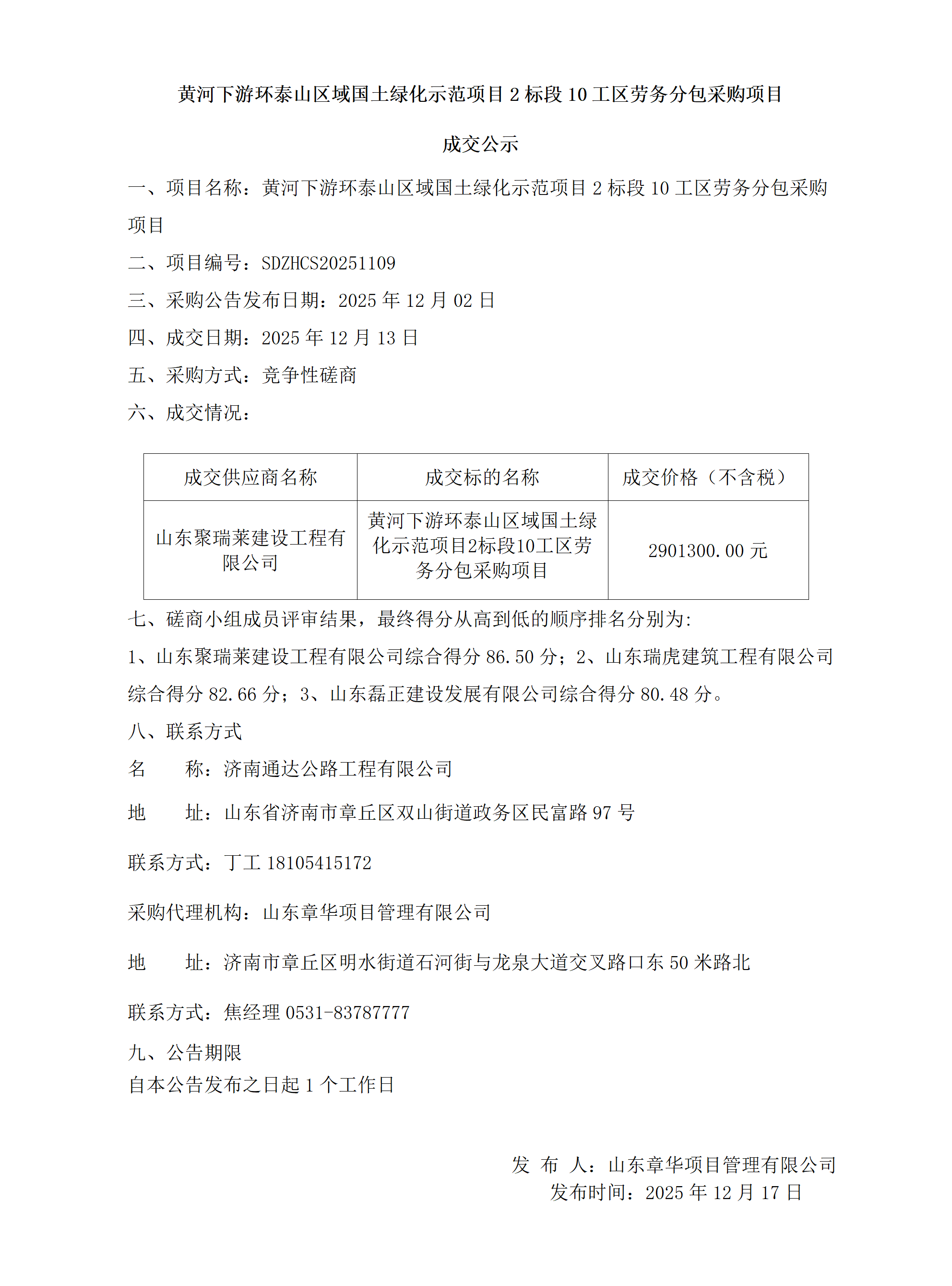 黄河下游环泰山区域国土绿化示范项目2标段10工区劳务分包采购项目成交公示