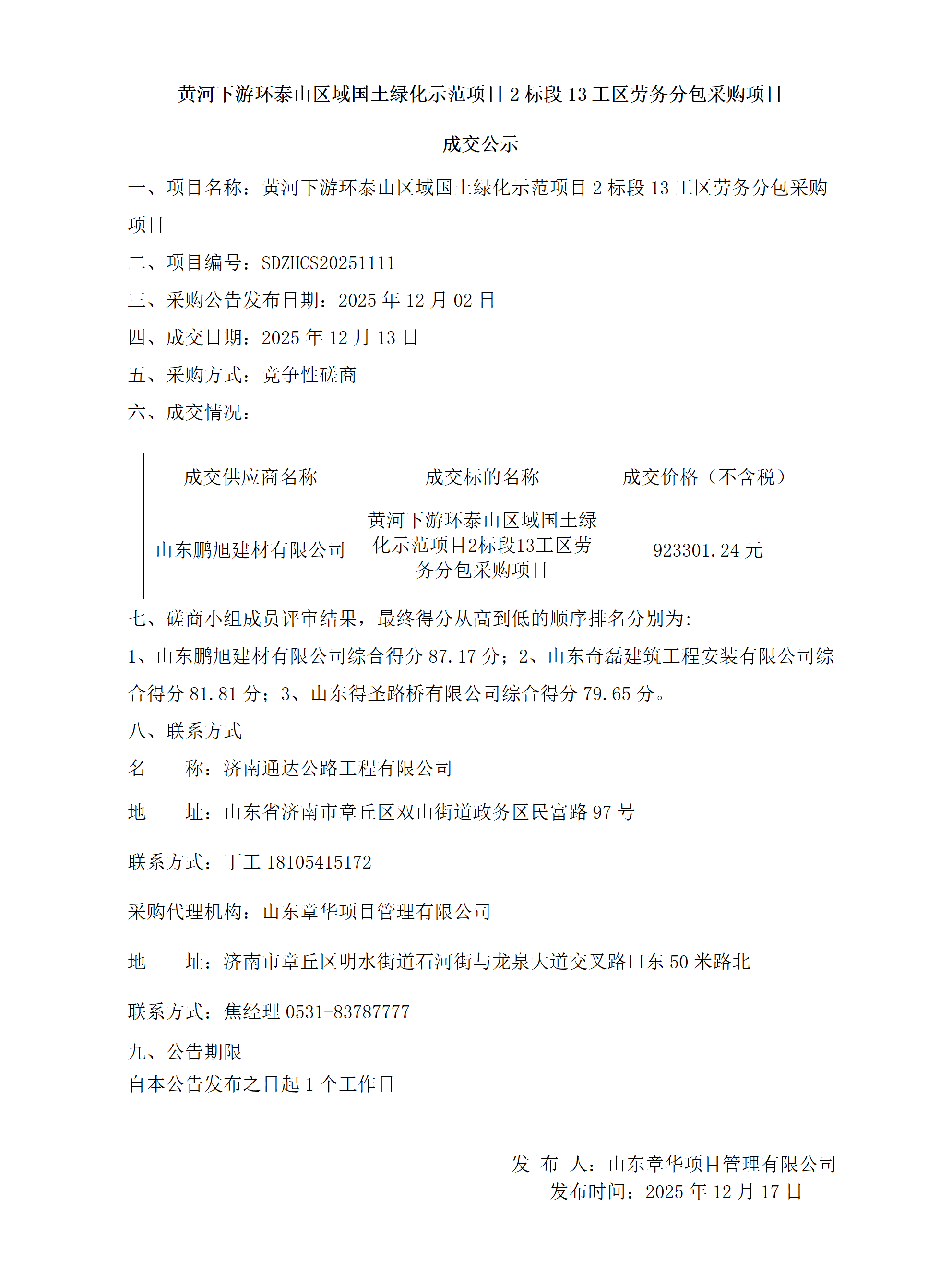 黄河下游环泰山区域国土绿化示范项目2标段13工区劳务分包采购项目成交公示