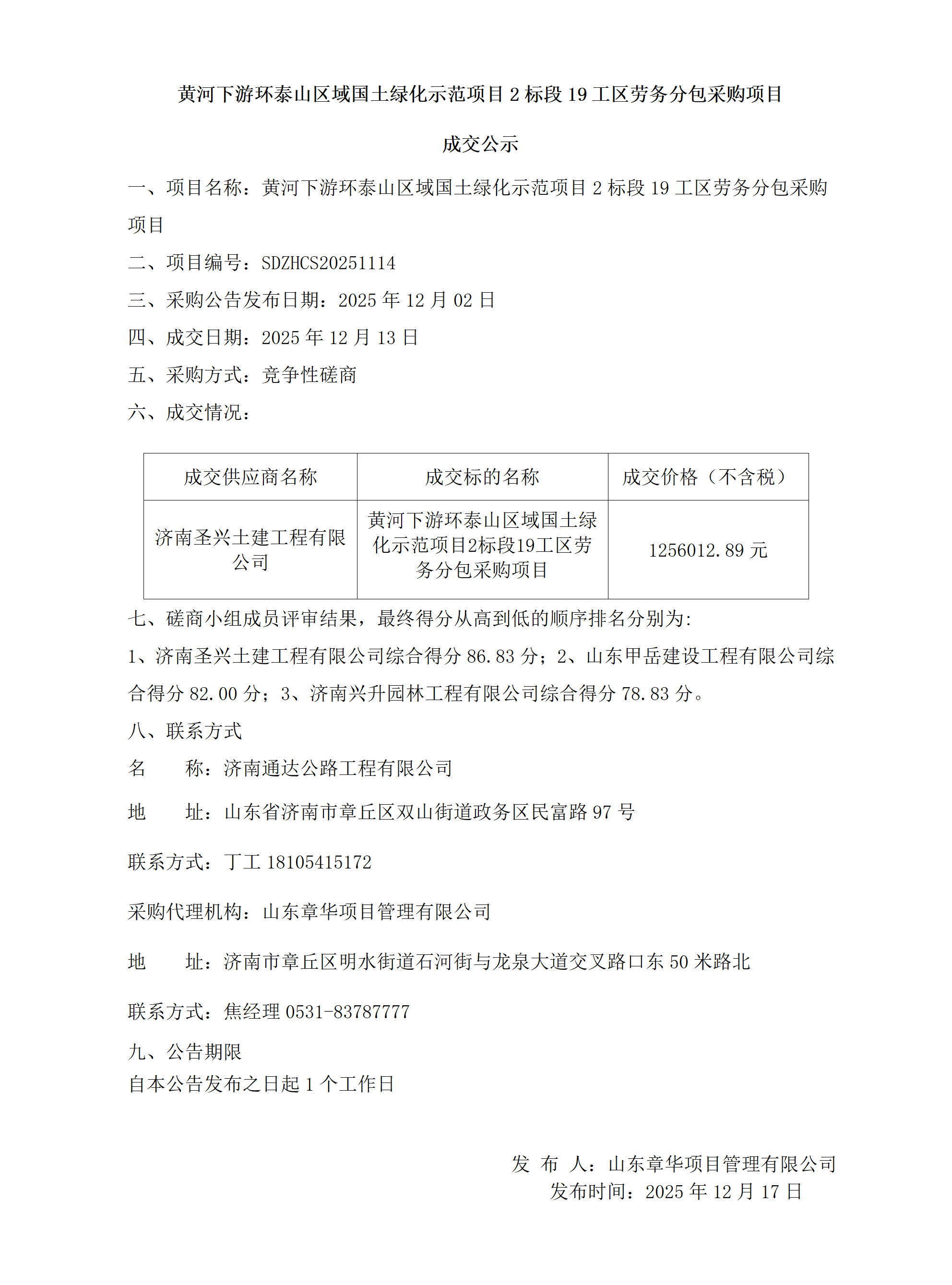黄河下游环泰山区域国土绿化示范项目2标段19工区劳务分包采购项目成交公示