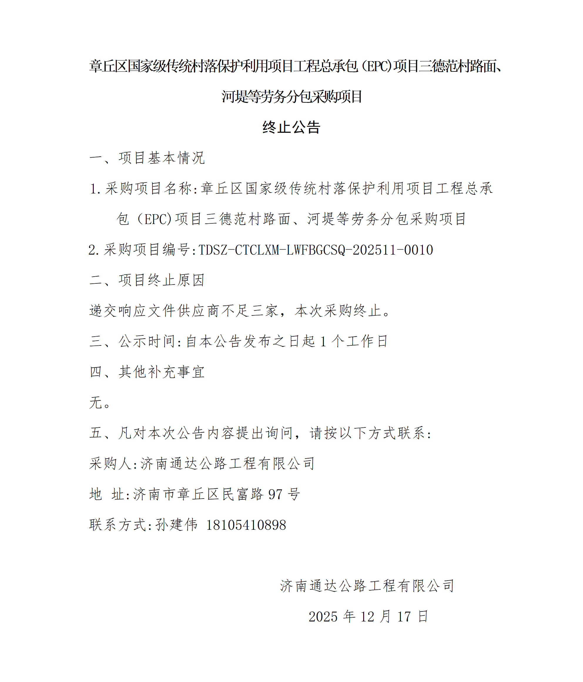 章丘区国家级传统村落保护利用项目工程总承包(EPC)项目三德范村路面、河堤等劳务分包采购项目终止公告