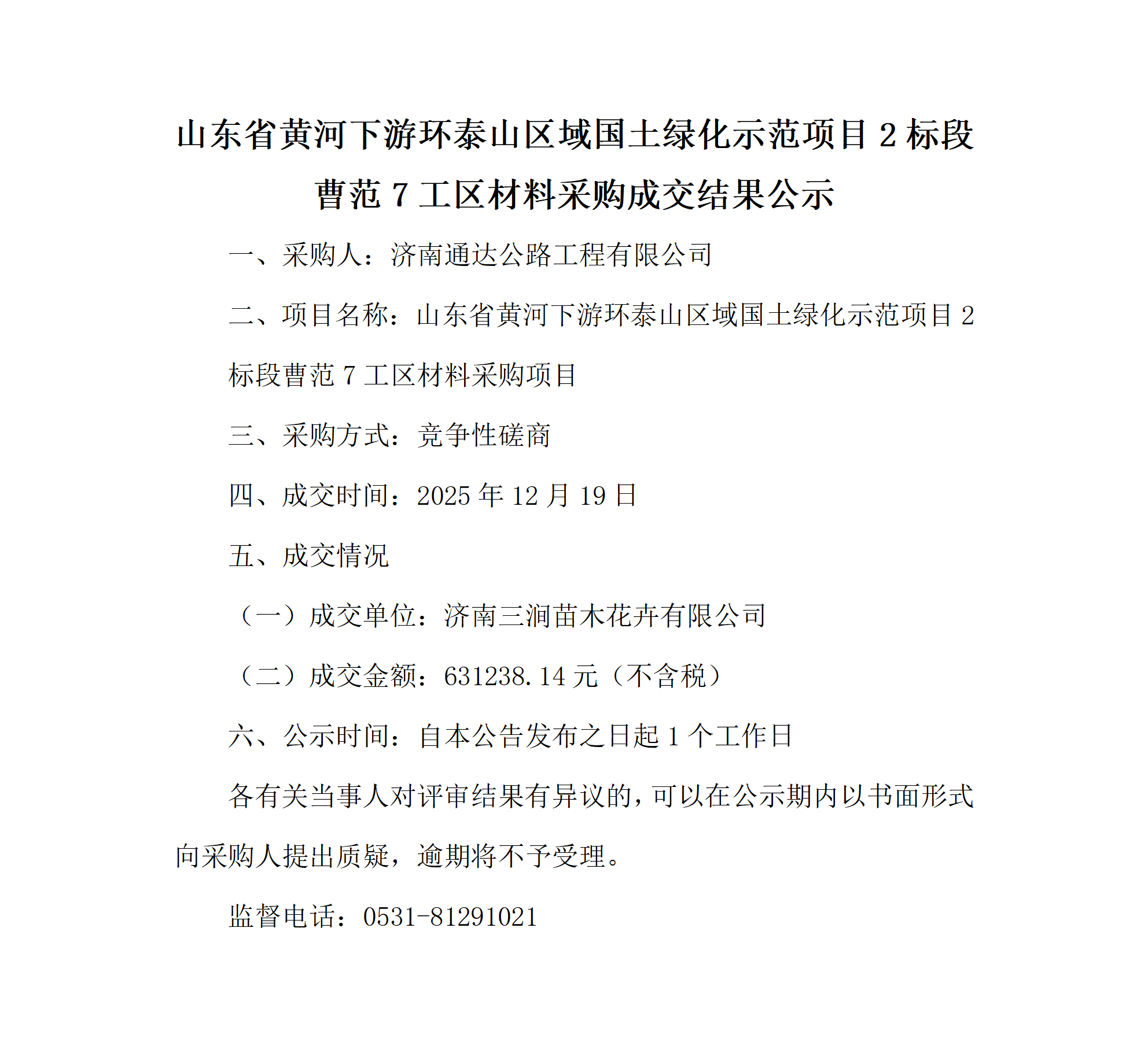 山东省黄河下游环泰山区域国土绿化示范项目2标段曹范7工区材料采购成交结果公示