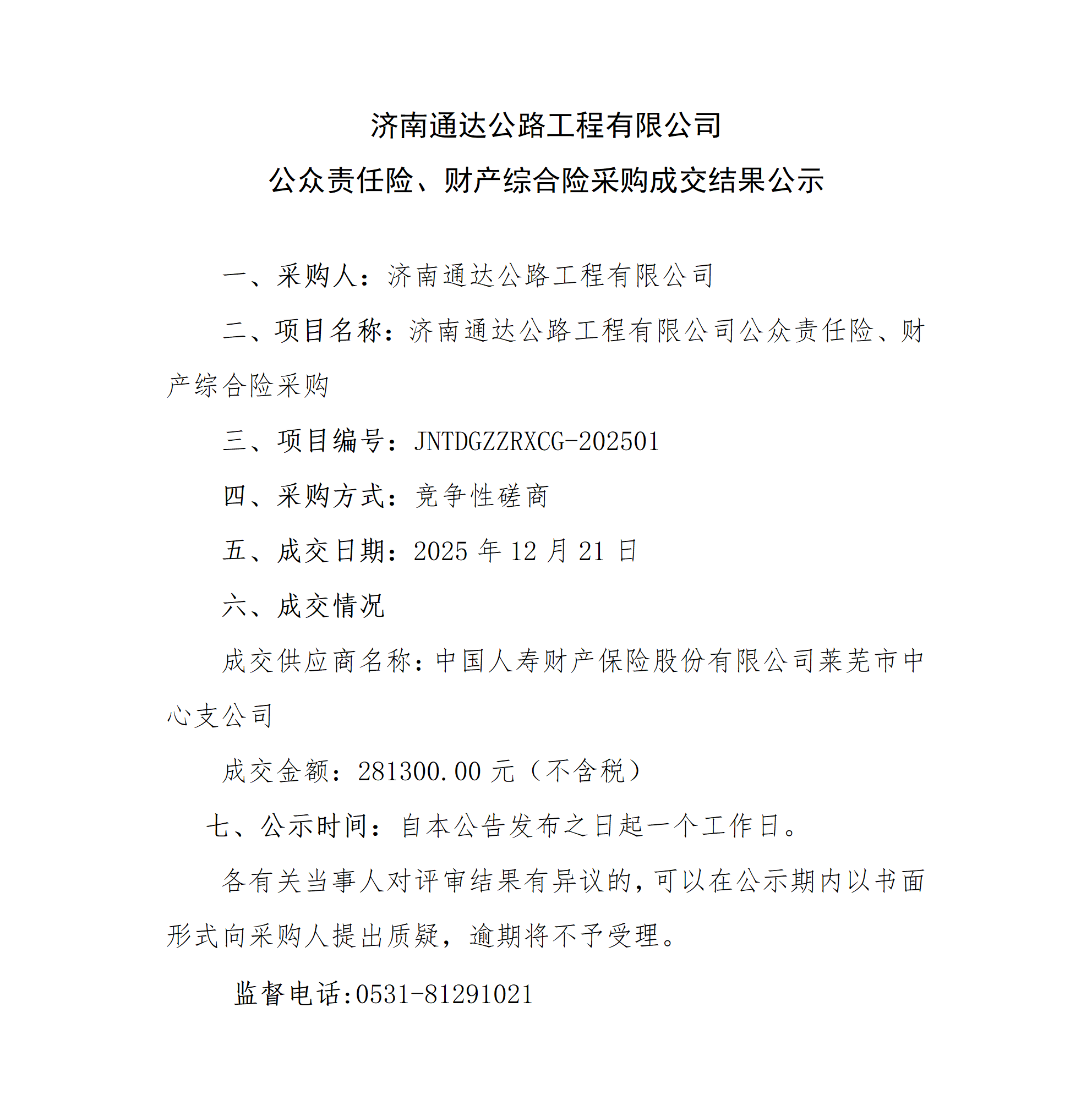 济南通达公路工程有限公司 公众责任险、财产综合险采购成交结果公示