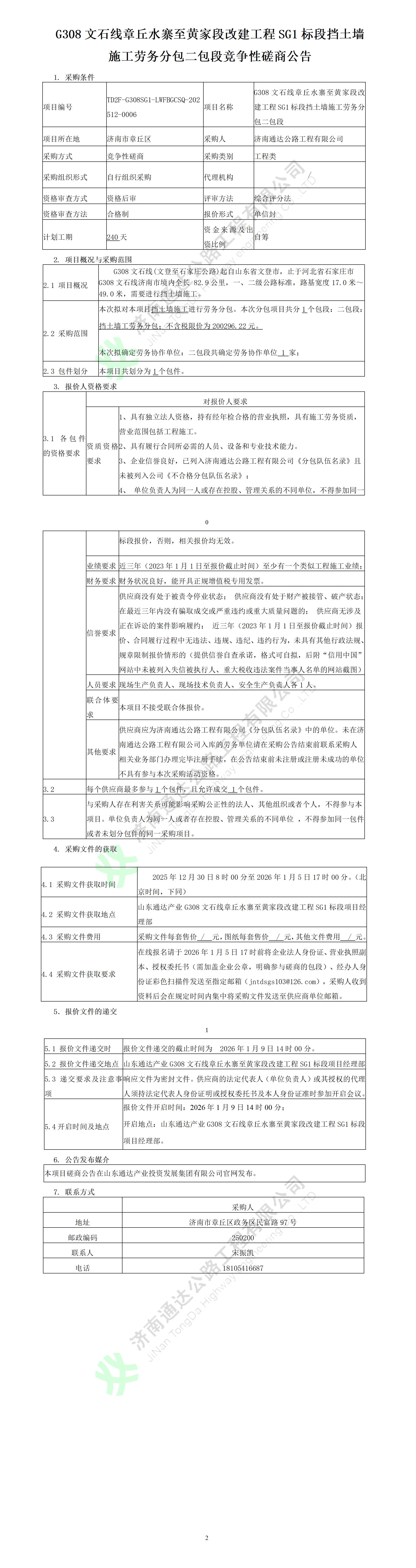 G308文石线章丘水寨至黄家段改建工程SG1标段挡土墙施工劳务分包二包段竞争性磋商公告
