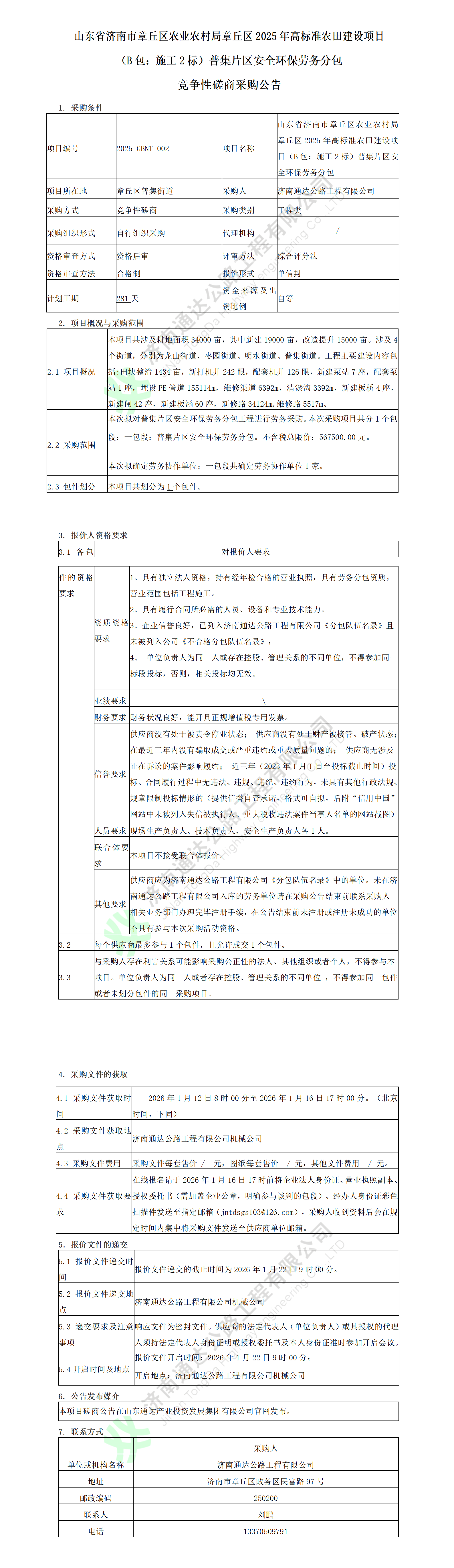 山东省济南市章丘区农业农村局章丘区2025年高标准农田建设项目(B包:施工2标)普集片区安全环保劳务分包竞争性磋商公告