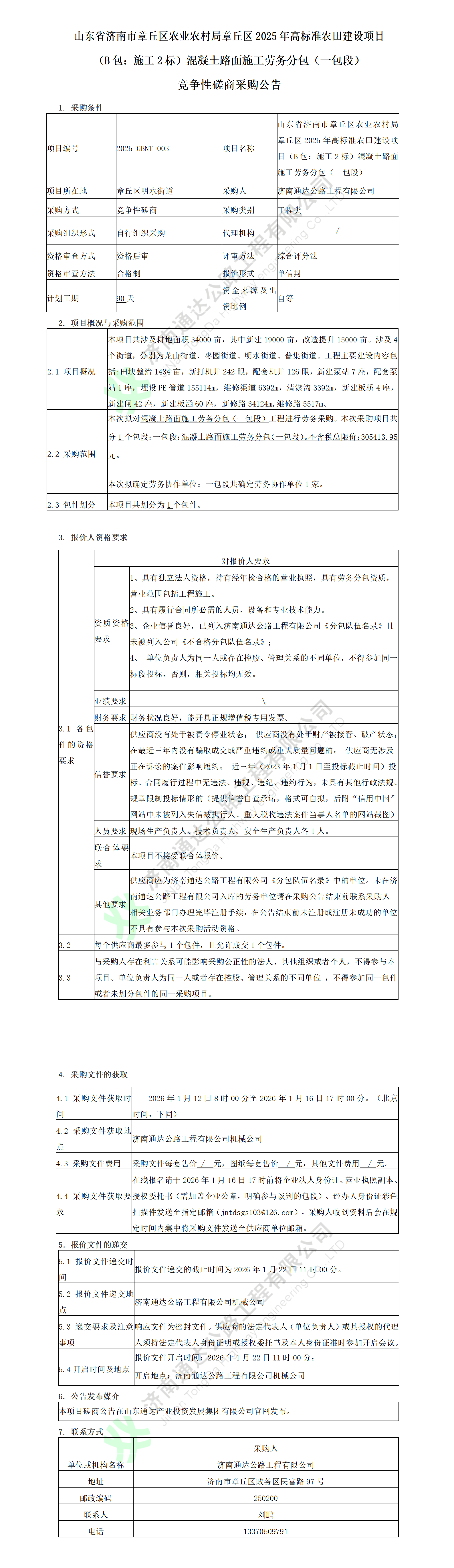 山东省济南市章丘区农业农村局章丘区2025年高标准农田建设项目(B包:施工2标)混凝土路面施工劳务分包(一包段)竞争性磋商公告 (1)
