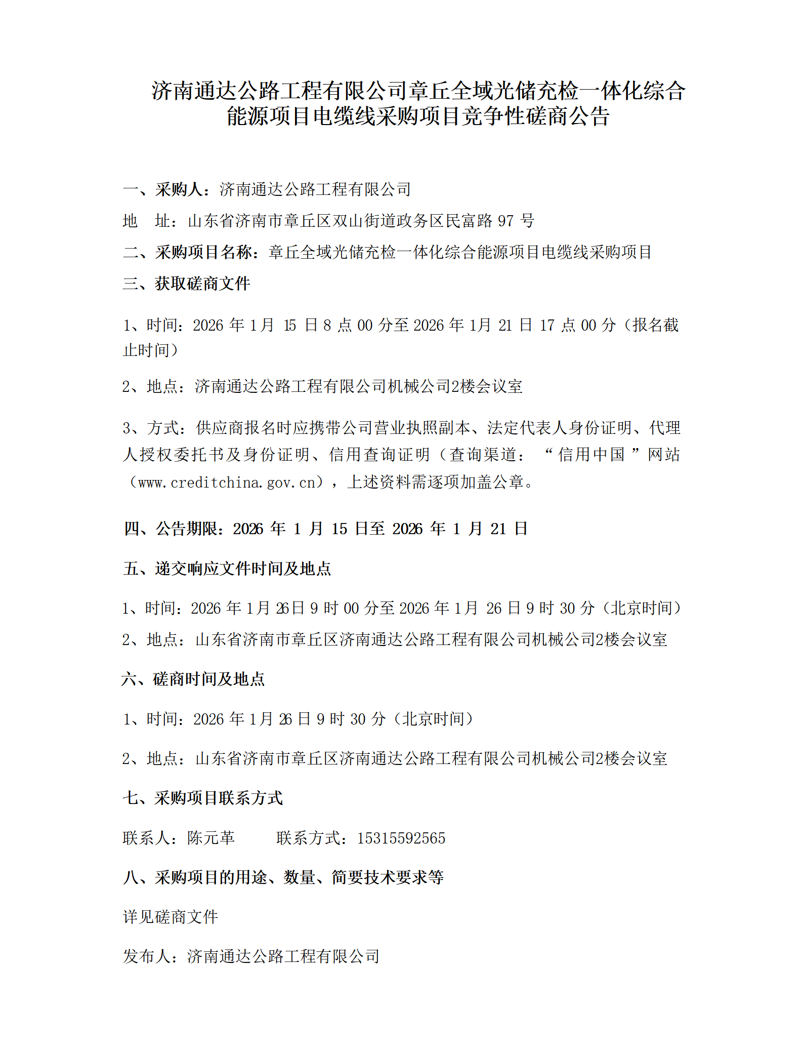 济南通达公路工程有限公司章丘全域光储充检一体化综合能源项目电缆线采购项目竞争性磋商公告