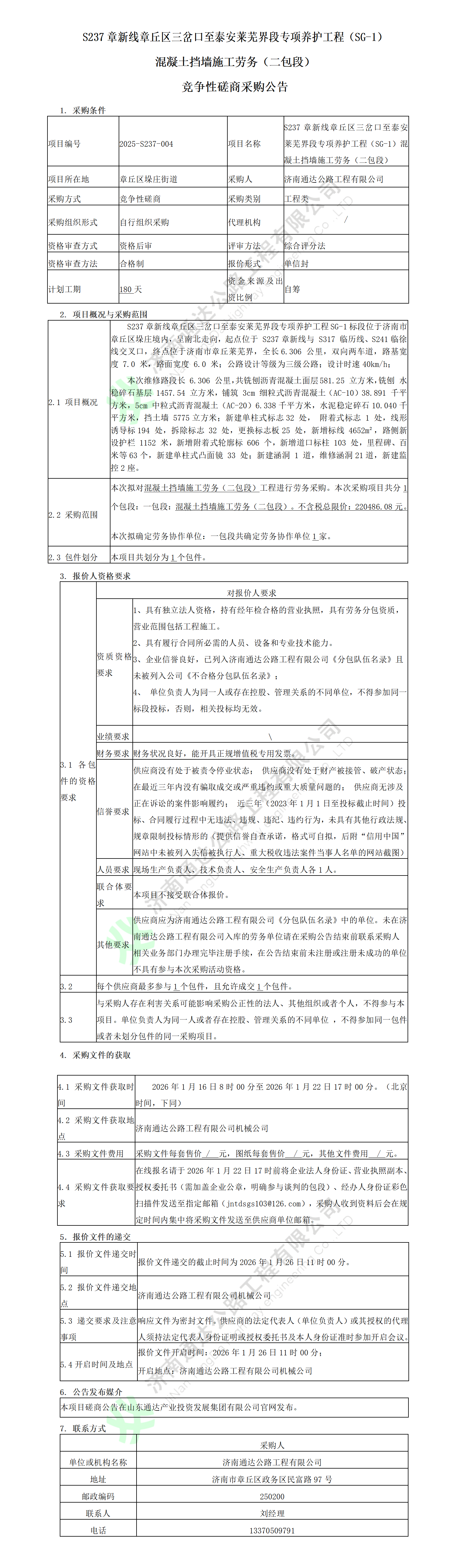 S237章新线章丘区三岔口至泰安莱芜界段专项养护工程(SG-1)混凝土挡墙施工劳务(二包段)竞争性磋商公告