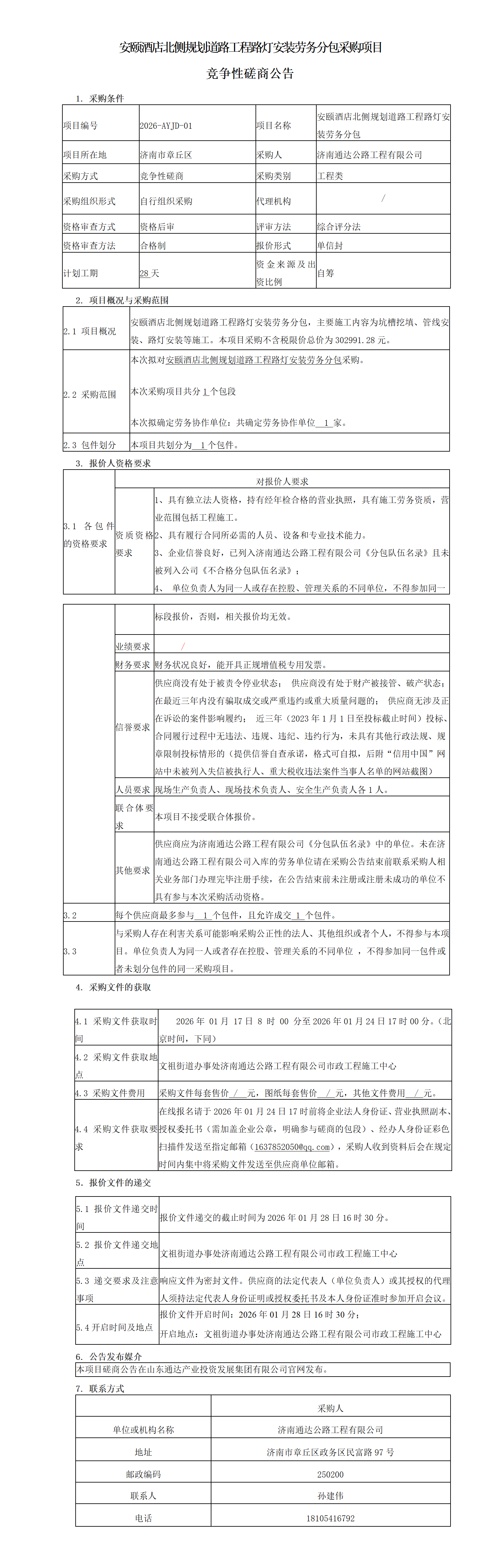 安颐酒店北侧规划道路工程路灯安装劳务分包采购项目竞争性磋商公告