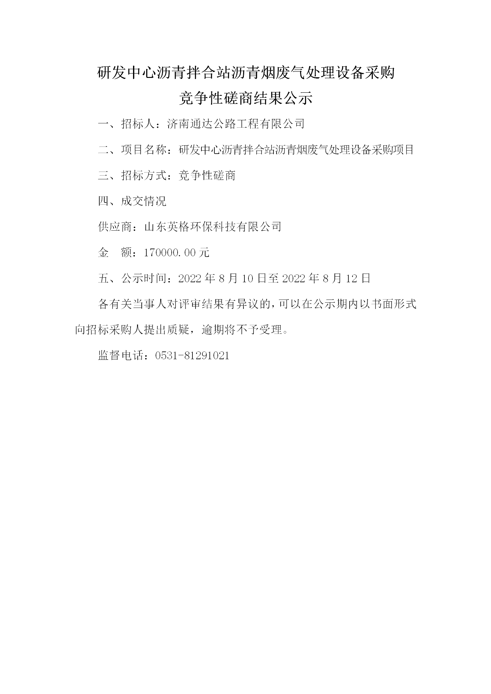 研发中心沥青拌合站沥青烟废气处理设备采购竞争性磋商结果公示