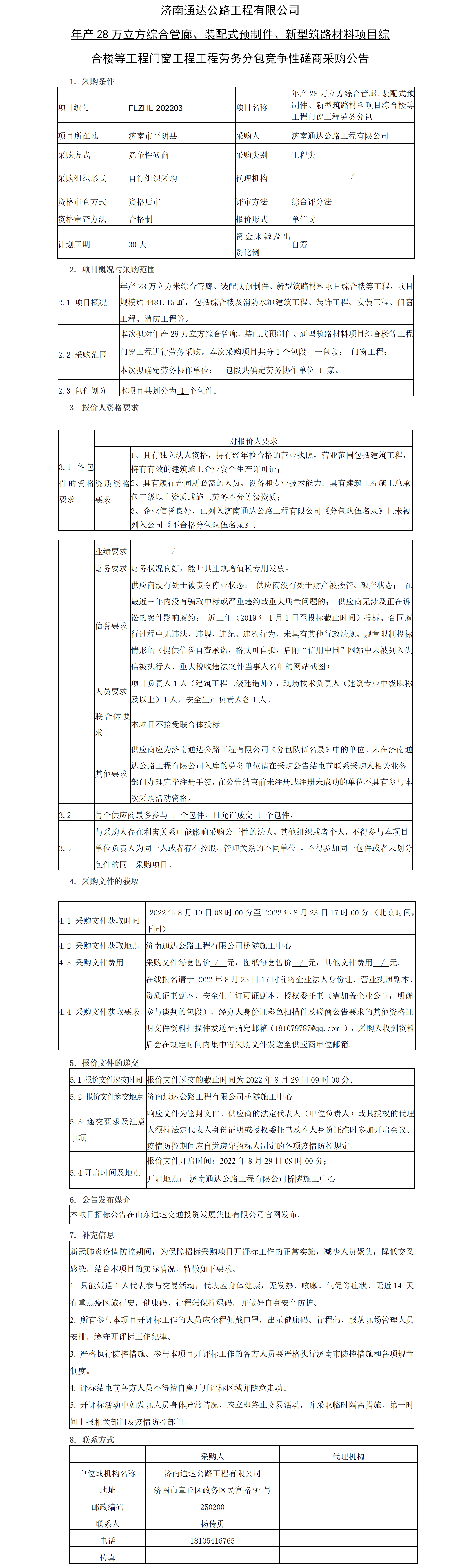 济南通达公路工程有限公司 年产28万立方综合管廊、装配式预制件、新型筑路材料项目综合楼等工程门窗工程工程劳务分包竞争性磋商采购公告