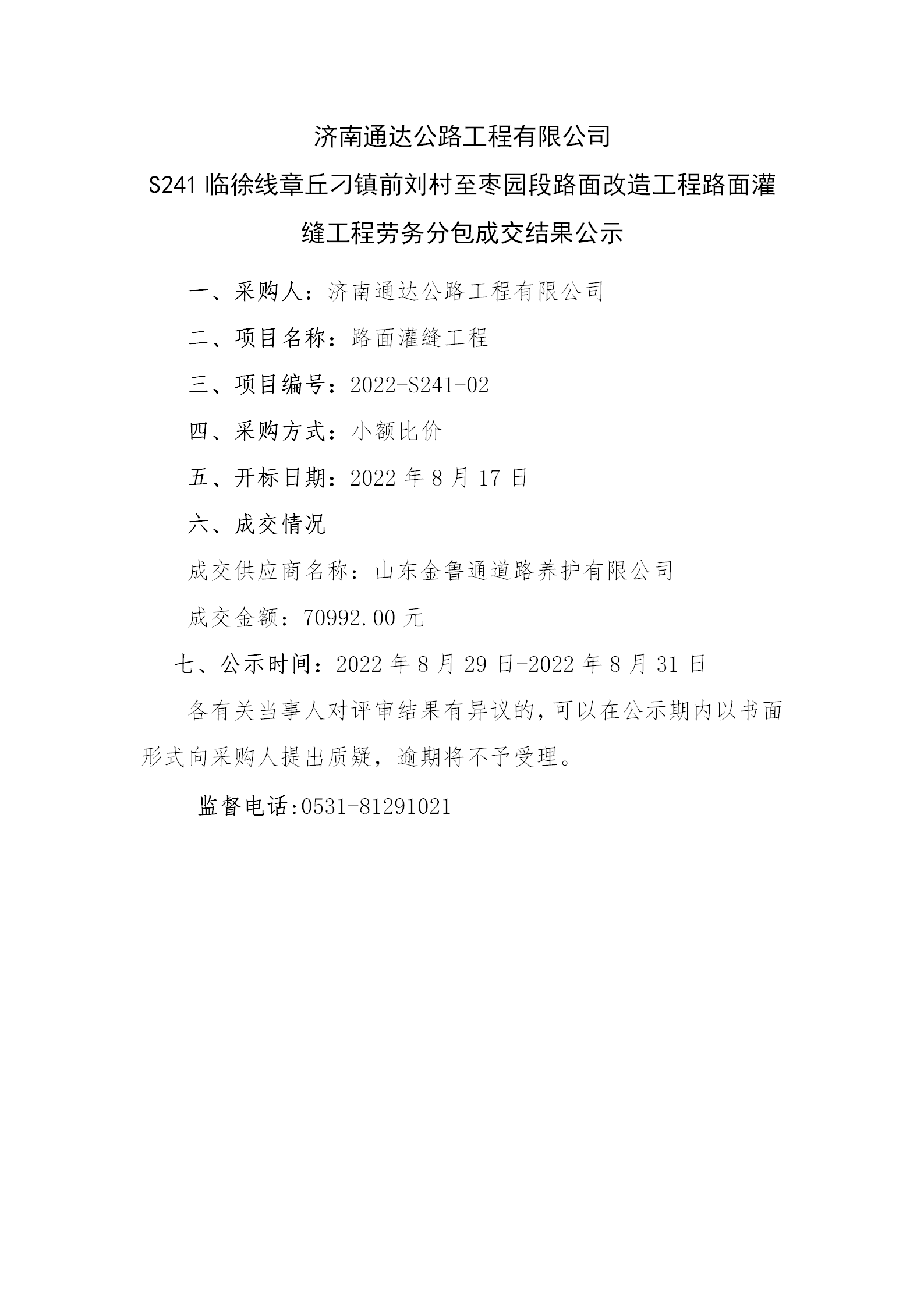 济南通达公路工程有限公司 S241临徐线章丘刁镇前刘村至枣园段路面改造工程路面灌缝工程劳务分包成交结果公示