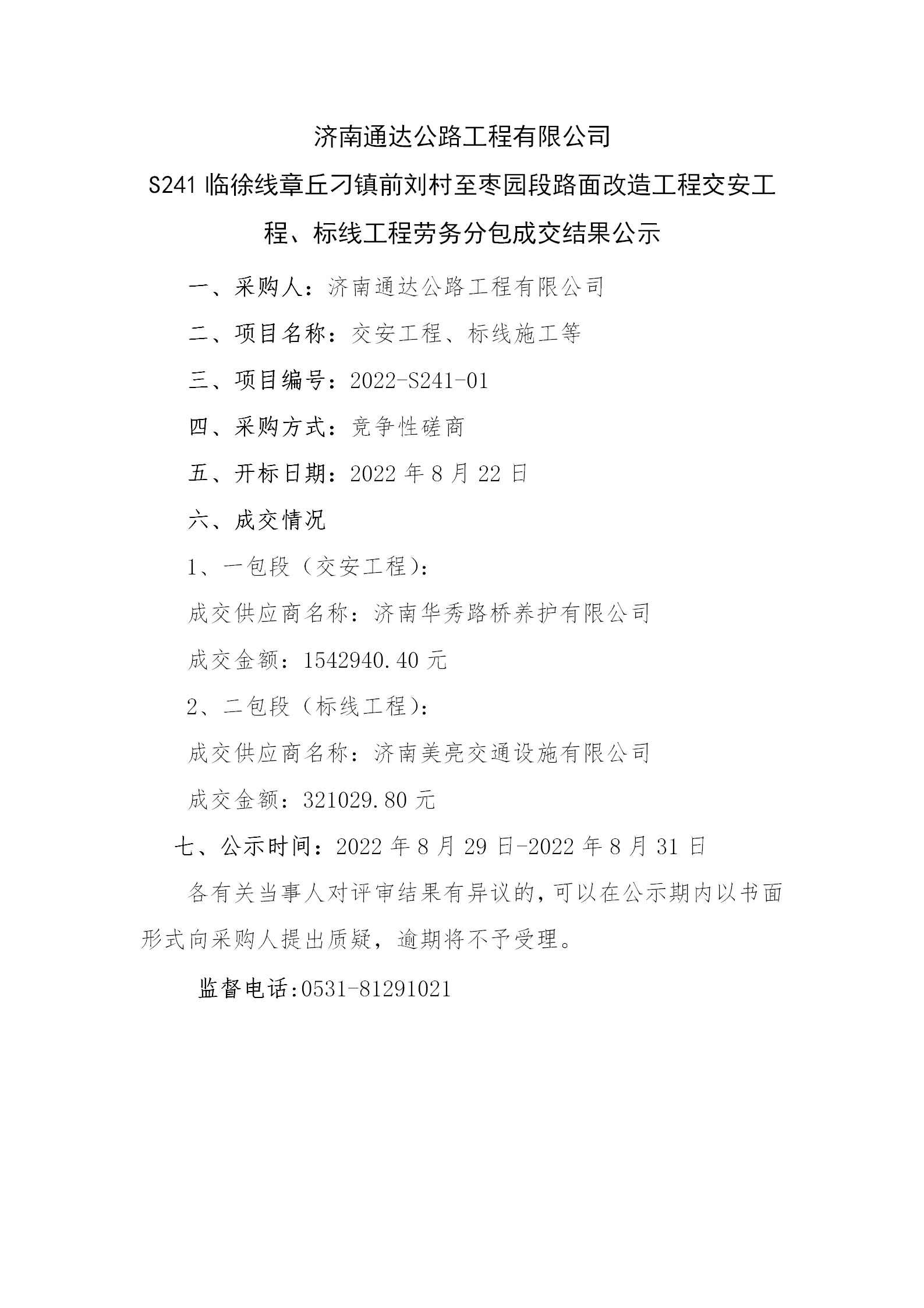 济南通达公路工程有限公司 S241临徐线章丘刁镇前刘村至枣园段路面改造工程交安工程、标线工程劳务分包成交结果公示