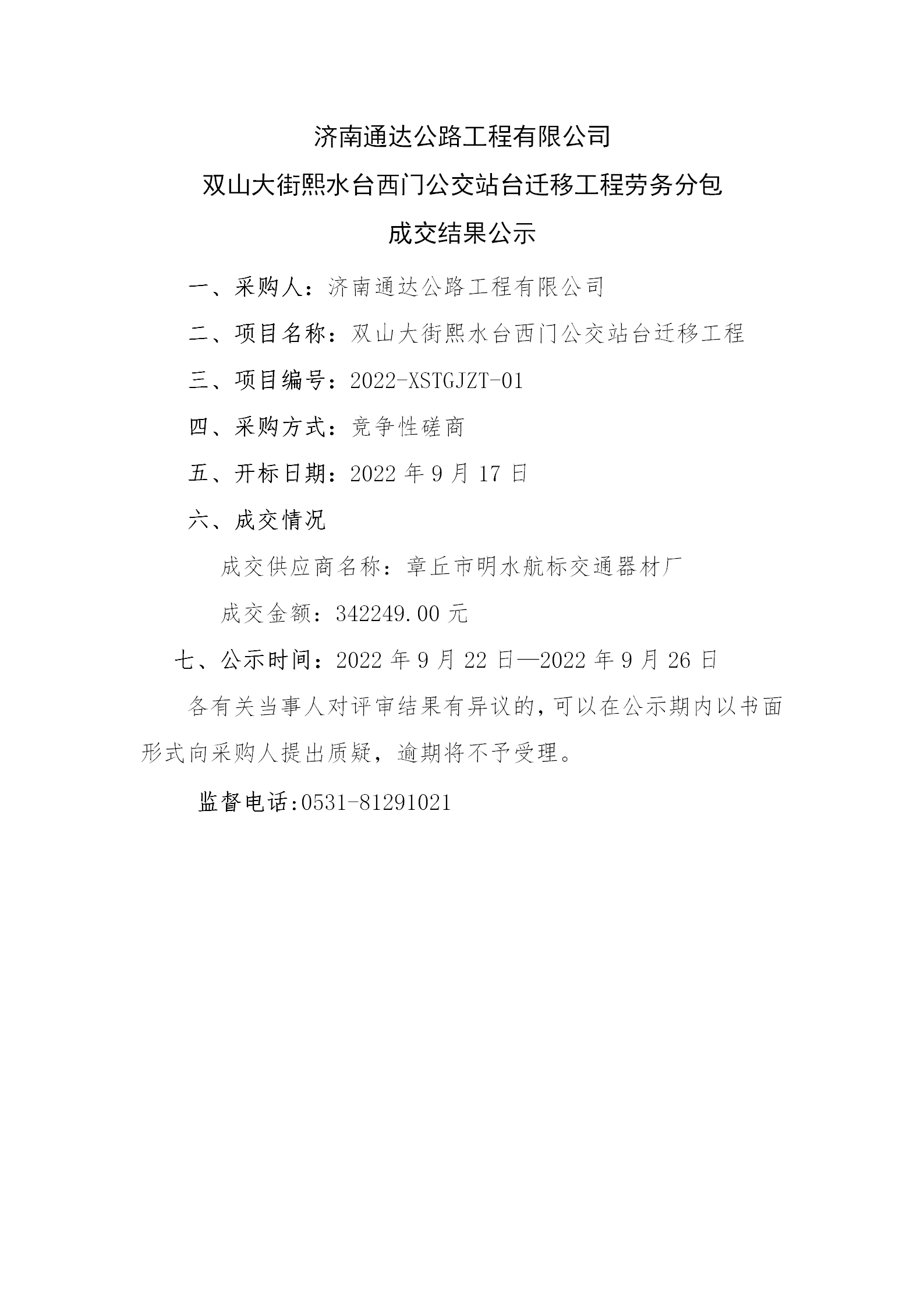 济南通达公路工程有限公司 双山大街熙水台西门公交站台迁移工程劳务分包 成交结果公示