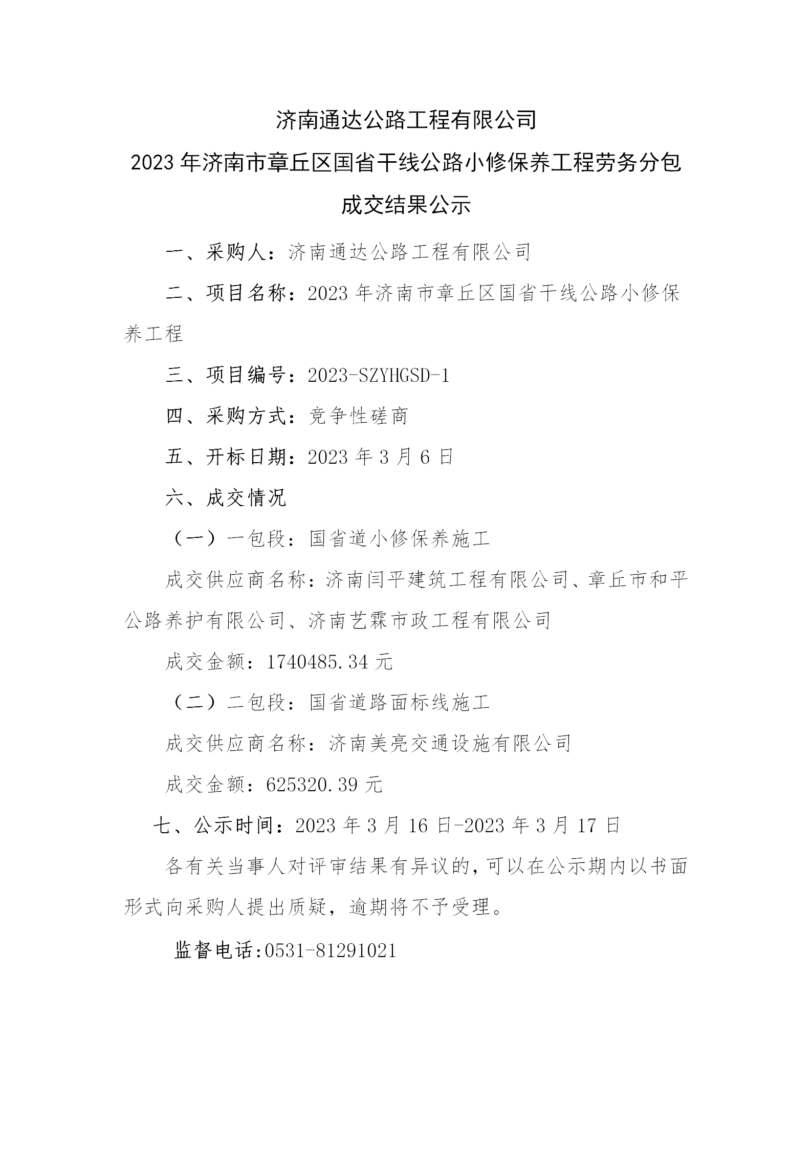 济南通达公路工程有限公司 2023年济南市章丘区国省干线公路小修保养工程劳务分包 成交结果公示