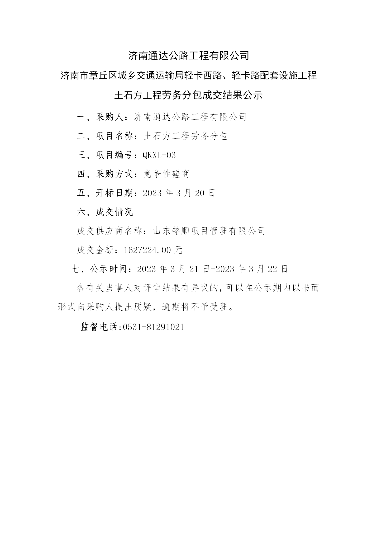 济南通达公路工程有限公司 济南市章丘区城乡交通运输局轻卡西路、轻卡路配套设施工程 土石方工程劳务分包成交结果公示