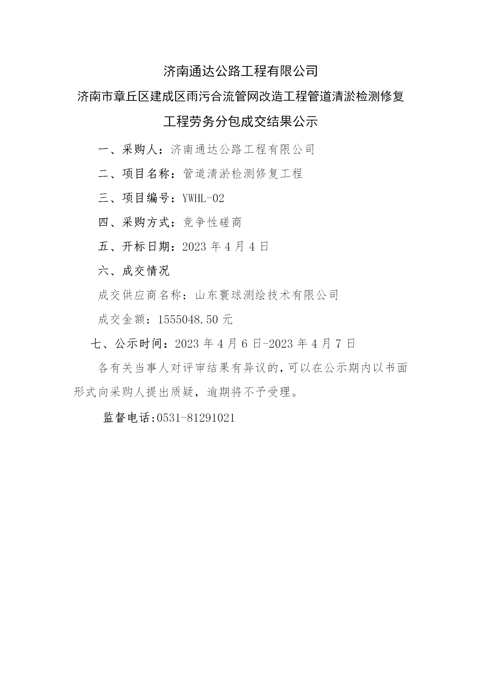 济南通达公路工程有限公司 济南市章丘区建成区雨污合流管网改造工程管道清淤检测修复工程劳务分包成交结果公示