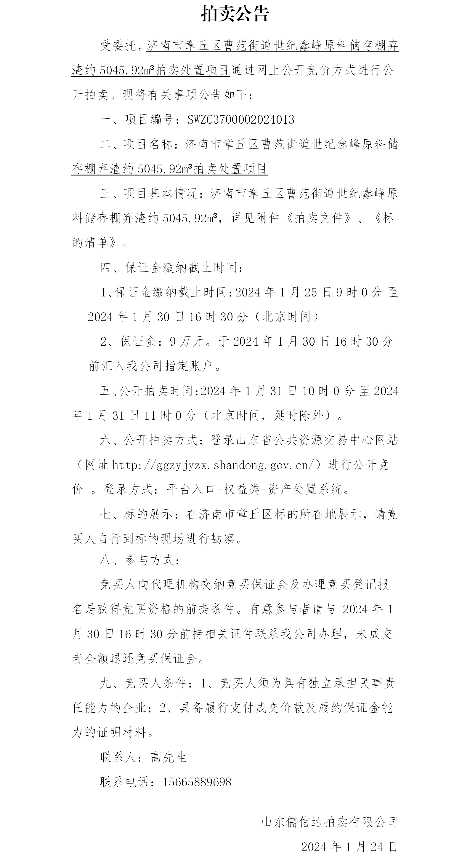 济南市章丘区曹范街道世纪鑫峰原料储存棚弃渣约5045.92m³拍卖处置项目
