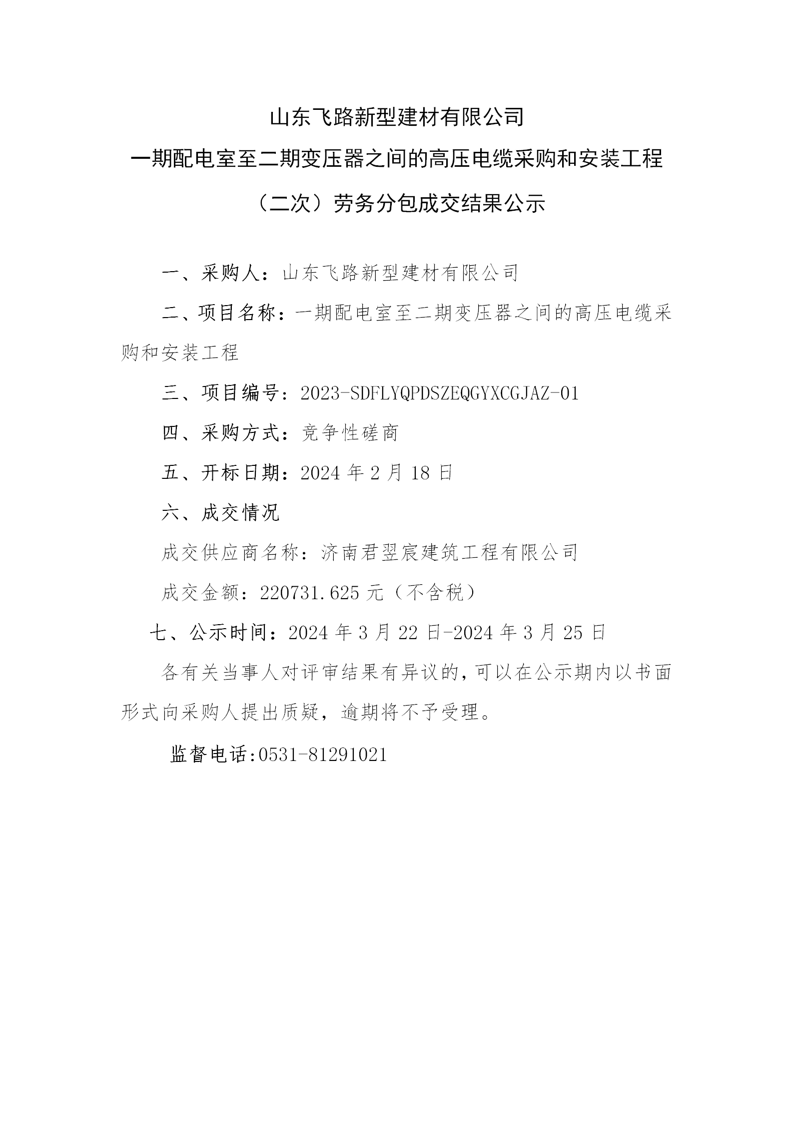 山东飞路新型建材有限公司 一期配电室至二期变压器之间的高压电缆采购和安装工程 (二次)劳务分包成交结果公示