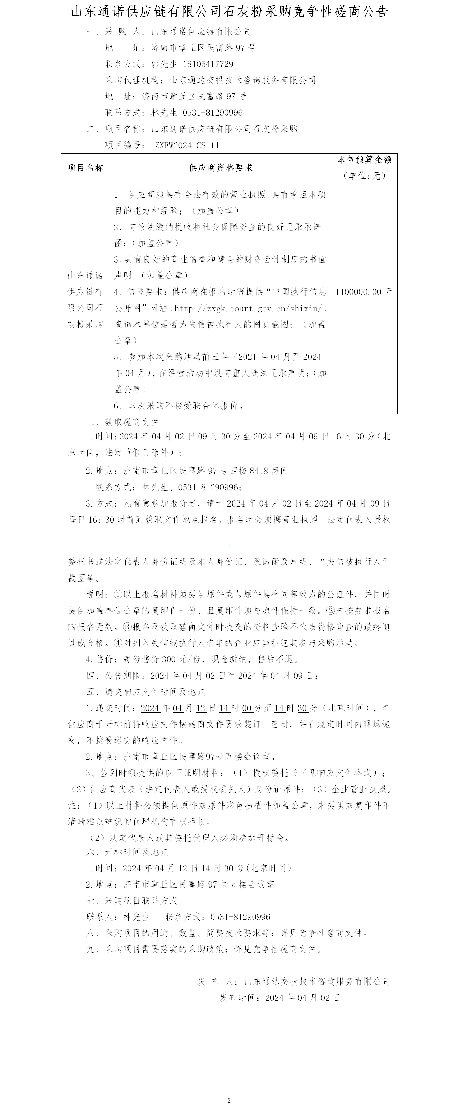 山东通诺供应链有限公司石灰粉采购竞争性磋商公告