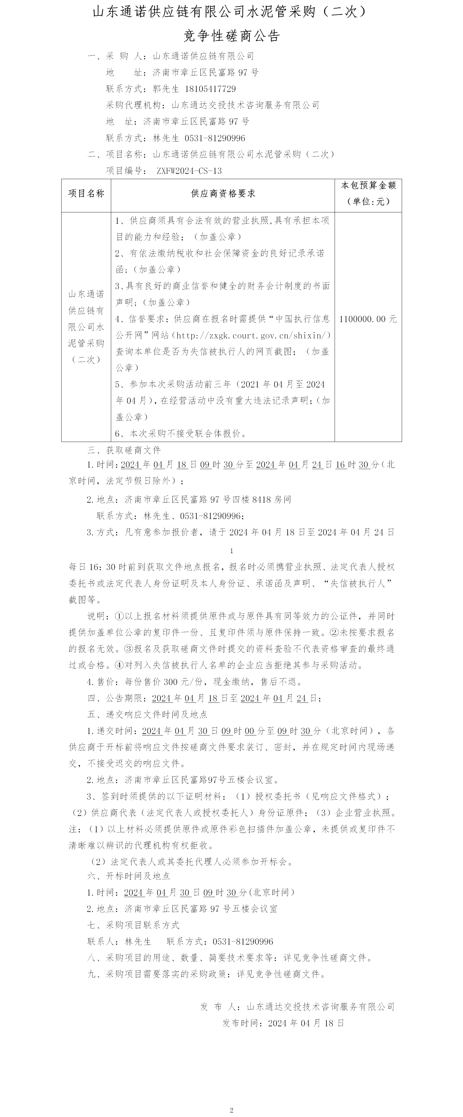 山东通诺供应链有限公司水泥管采购(二次) 竞争性磋商公告