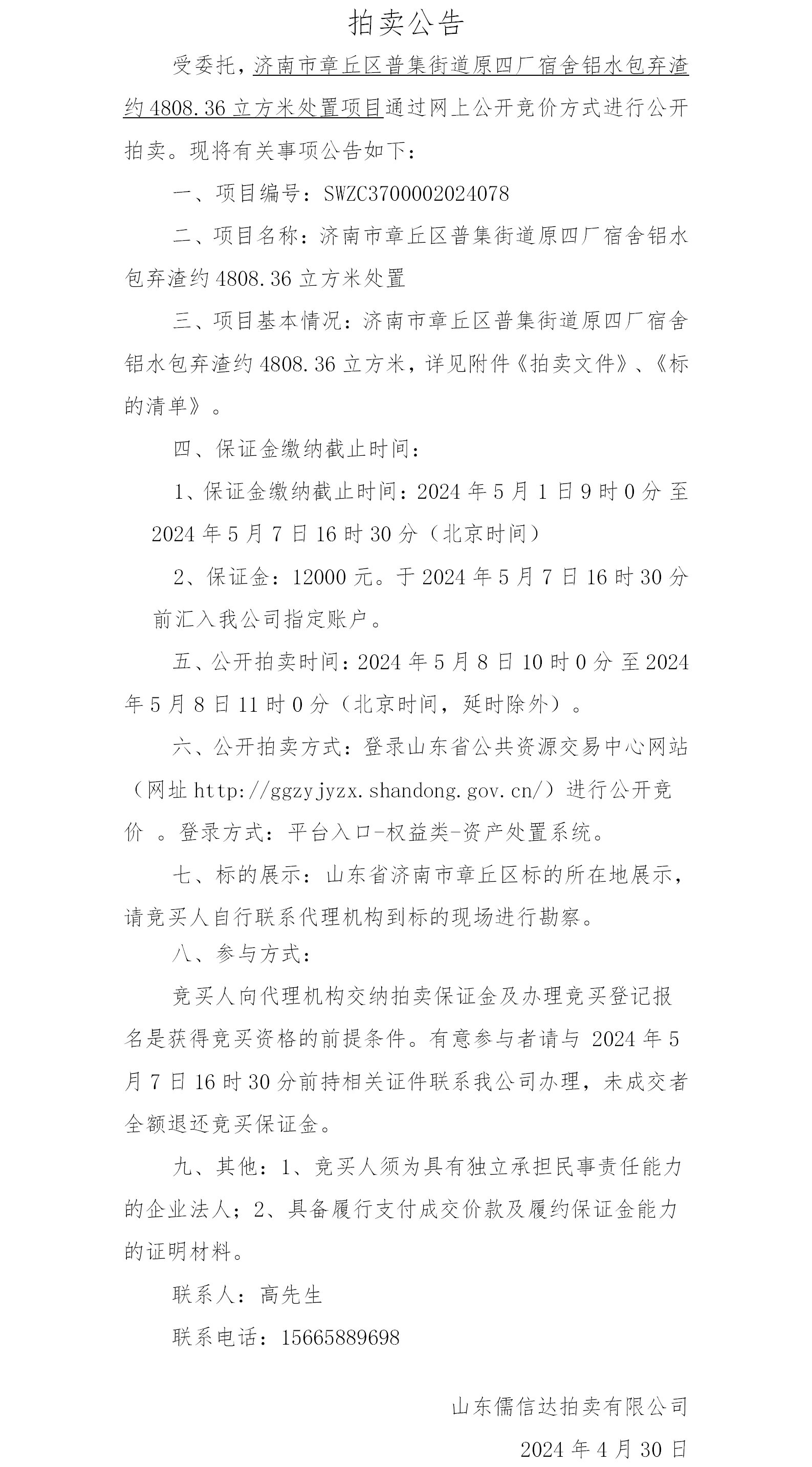济南市章丘区普集街道原四厂宿舍铝水包弃渣约4808.36立方米处置
