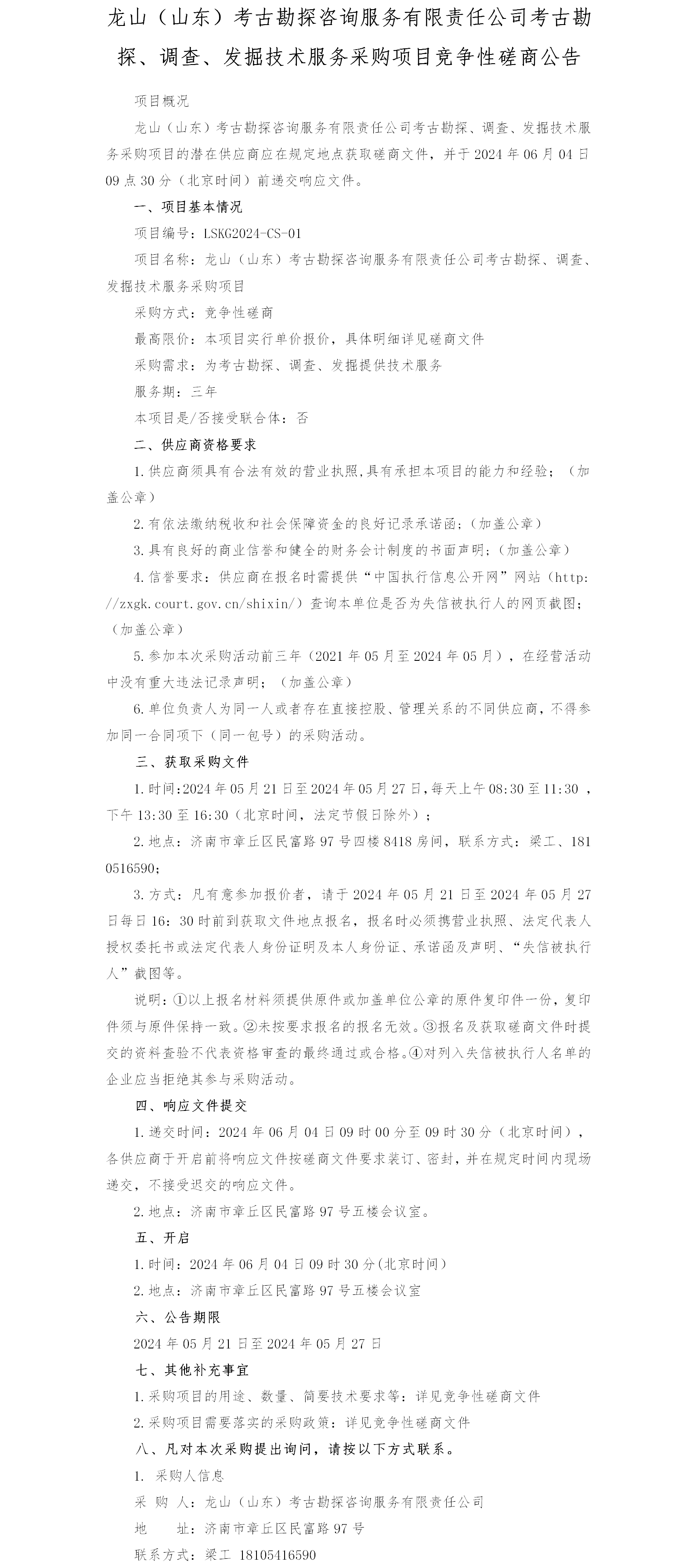 龙山(山东)考古勘探咨询服务有限责任公司考古勘探、调查、发掘技术服务采购项目竞争性磋商公告
