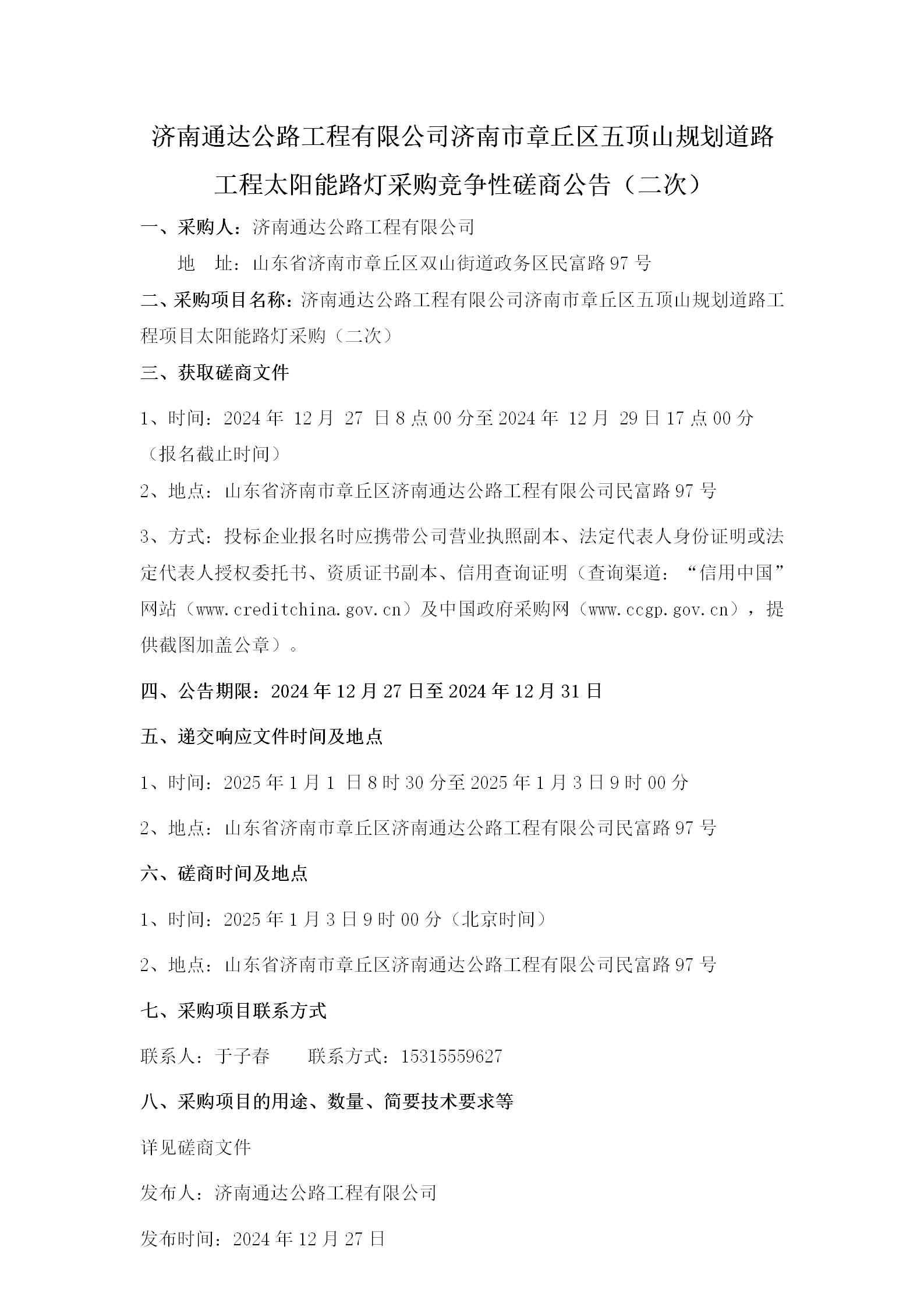 济南通达公路工程有限公司济南市章丘区五顶山规划道路工程太阳能路灯采购竞争性磋商公告(二次)