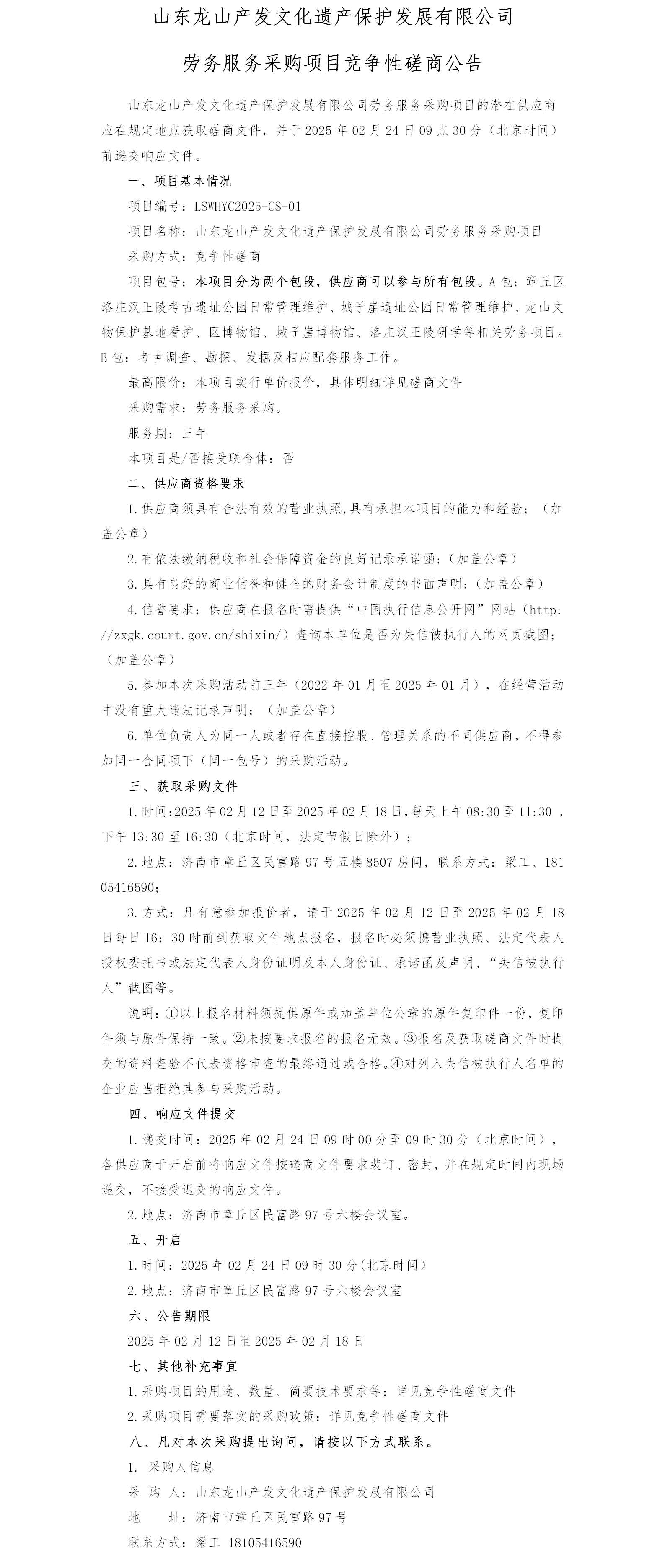 山东龙山产发文化遗产保护发展有限公司 劳务服务采购项目竞争性磋商公告