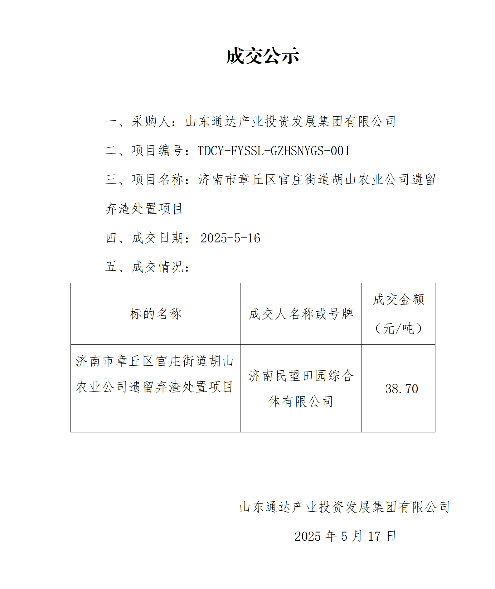 济南市章丘区官庄街道胡山农业公司遗留弃渣处置项目成交公示