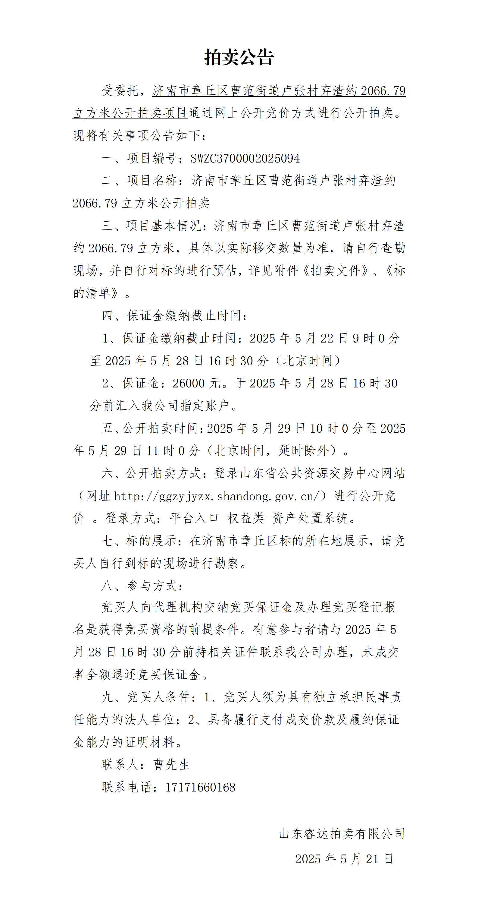 济南市章丘区曹范街道卢张村弃渣约2066.79立方米公开拍卖项目拍卖公告