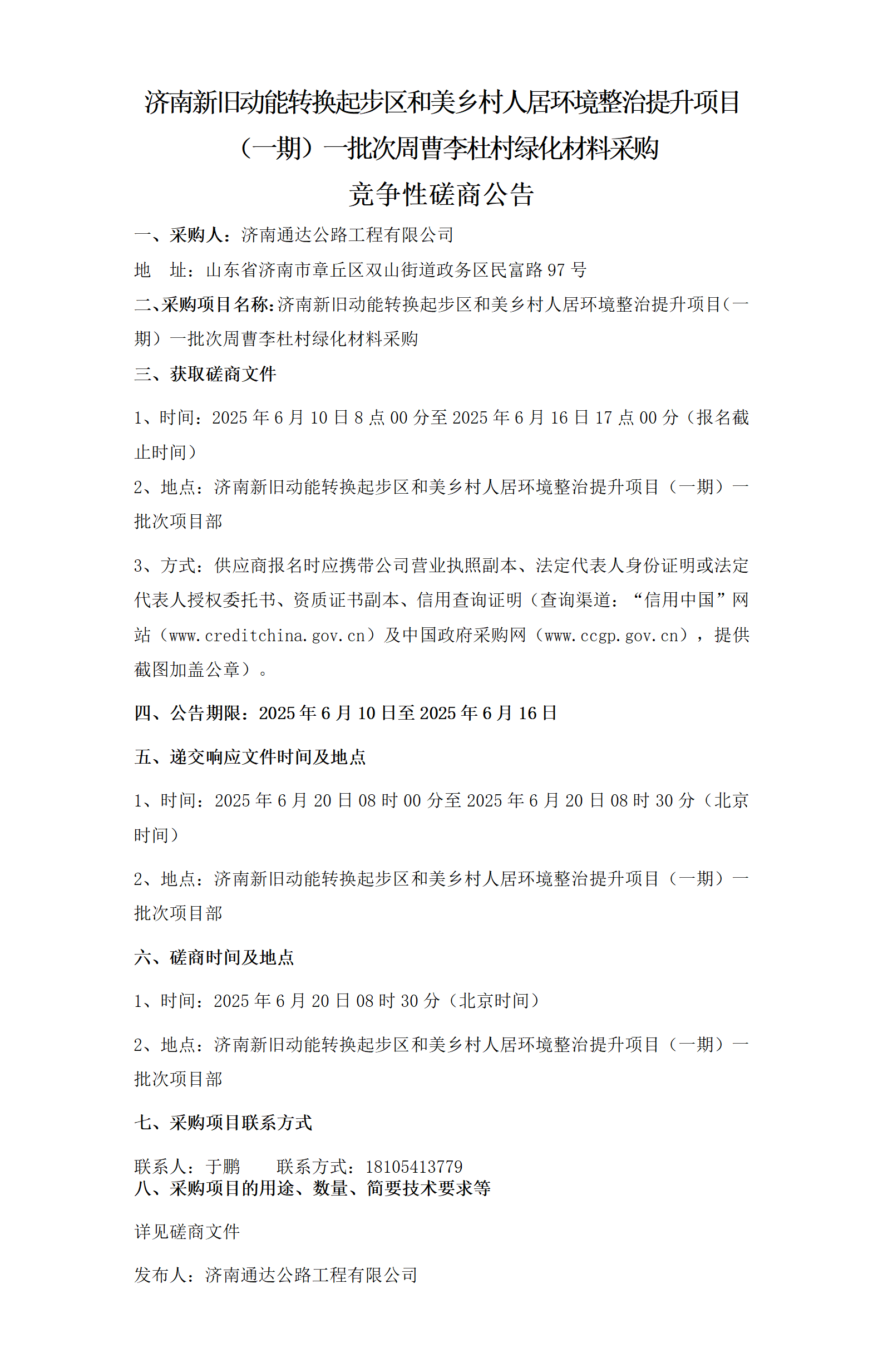 济南新旧动能转换起步区和美乡村人居环境整治提升项目(一期)一批次周曹李杜村绿化材料采购竞争性磋商公告