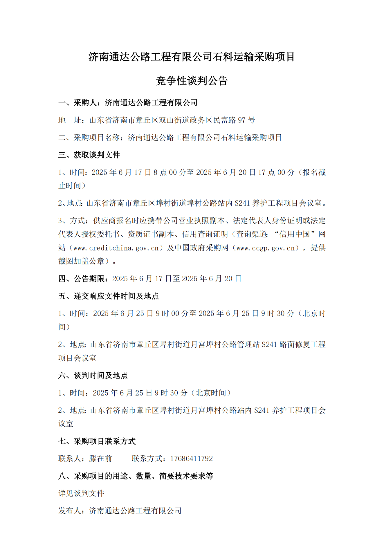 济南通达公路工程有限公司石料运输采购项目竞争性谈判公告