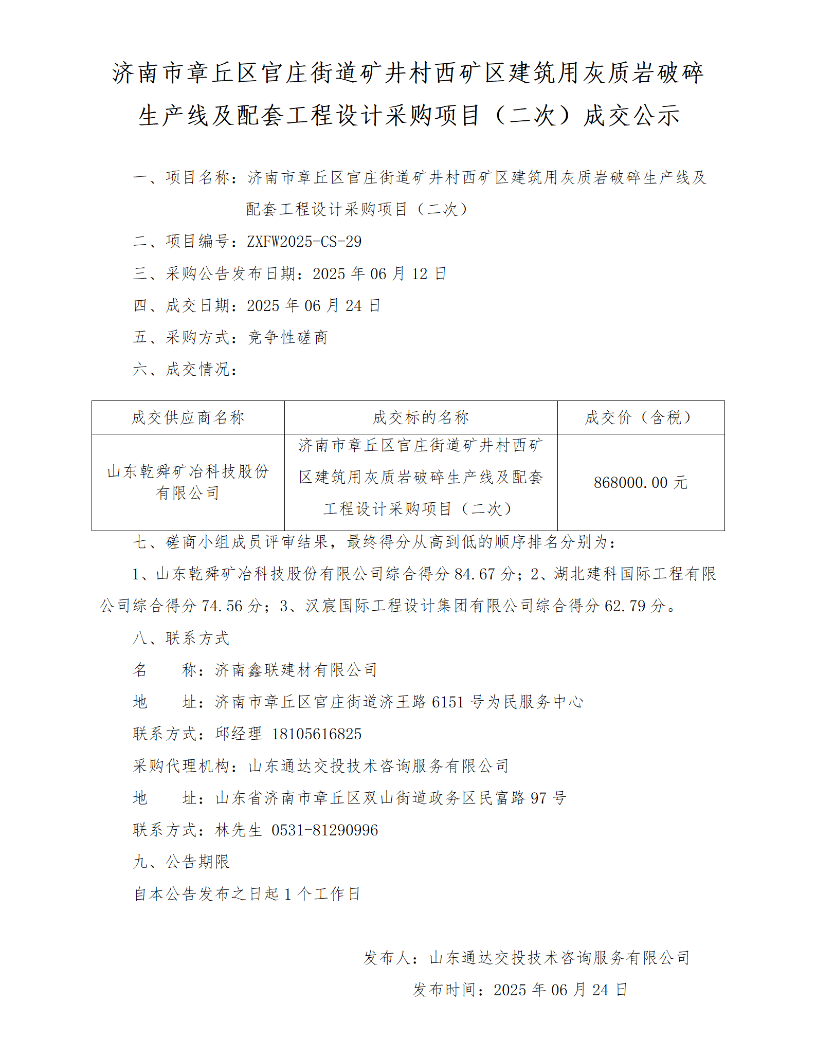 济南市章丘区官庄街道矿井村西矿区建筑用灰质岩破碎生产线及配套工程设计采购项目(二次)成交公示