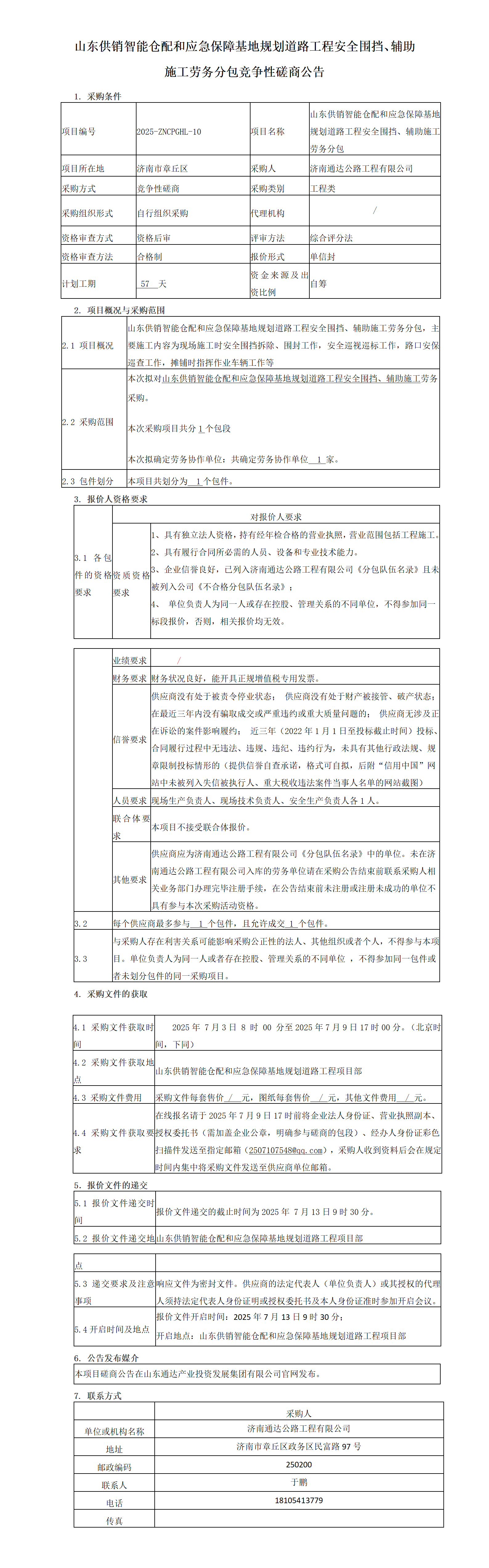 山东供销智能仓配和应急保障基地规划道路工程安全围挡、辅助施工劳务分包竞争性磋商公告
