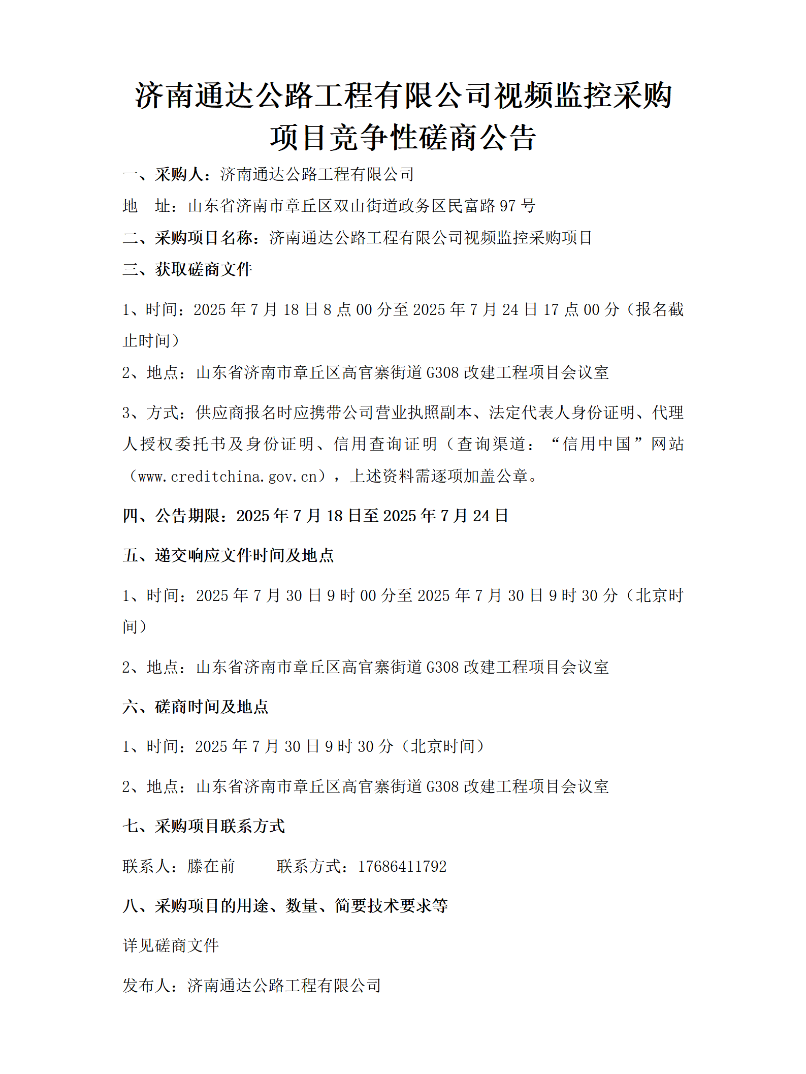 济南通达公路工程有限公司视频监控采购项目竞争性磋商公告