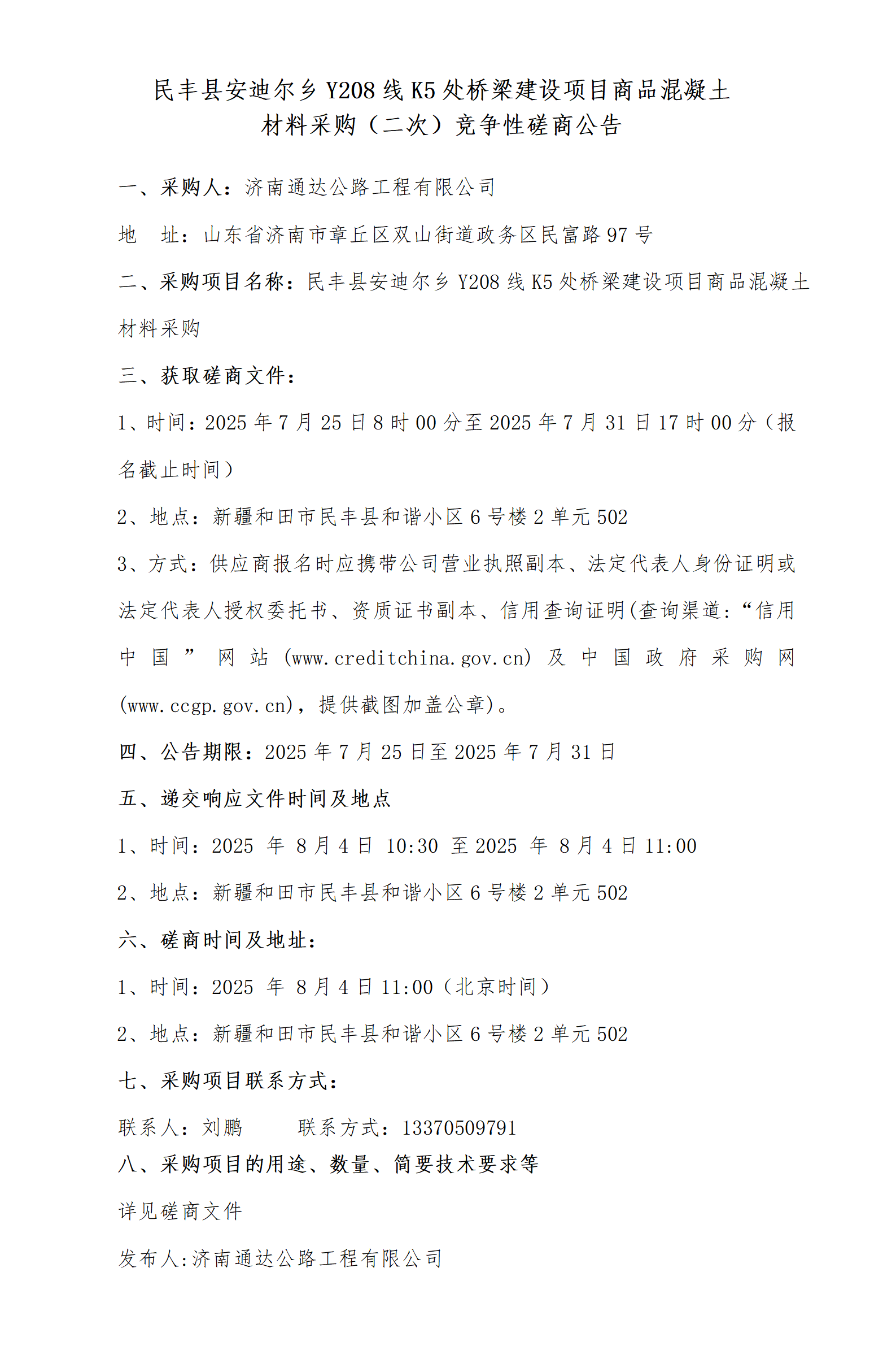 民丰县安迪尔乡Y208线K5处桥梁建设项目商品混凝土材料采购(二次)竞争性磋商公告